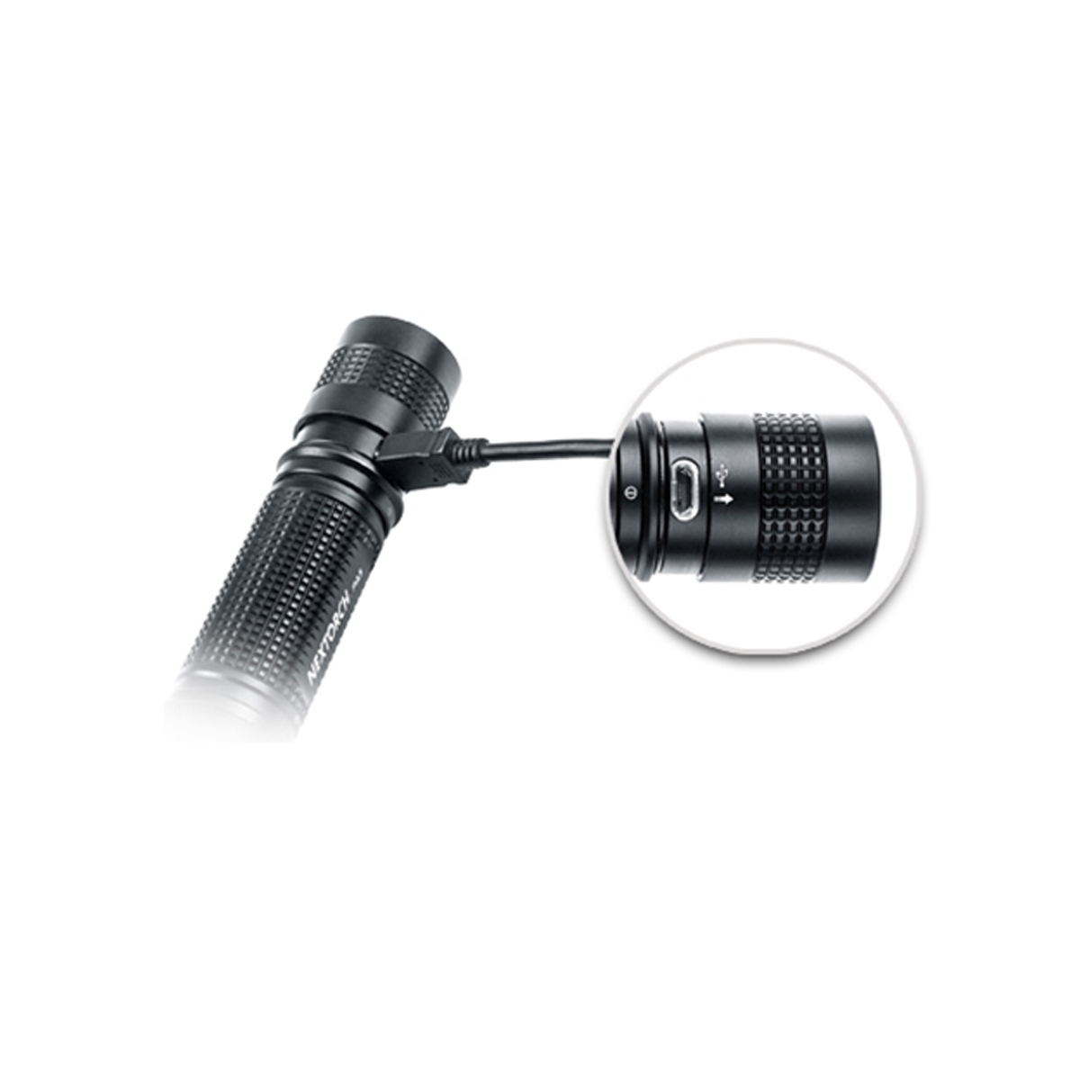 - Ładowanie odbywa się za pomocą portu USB ukrytego pod nakrętką włącznika.