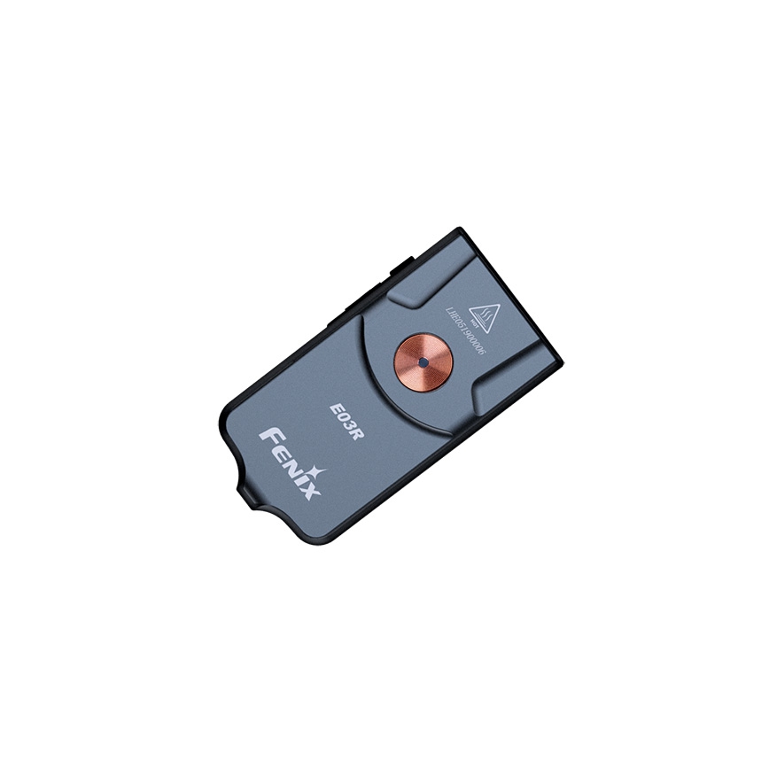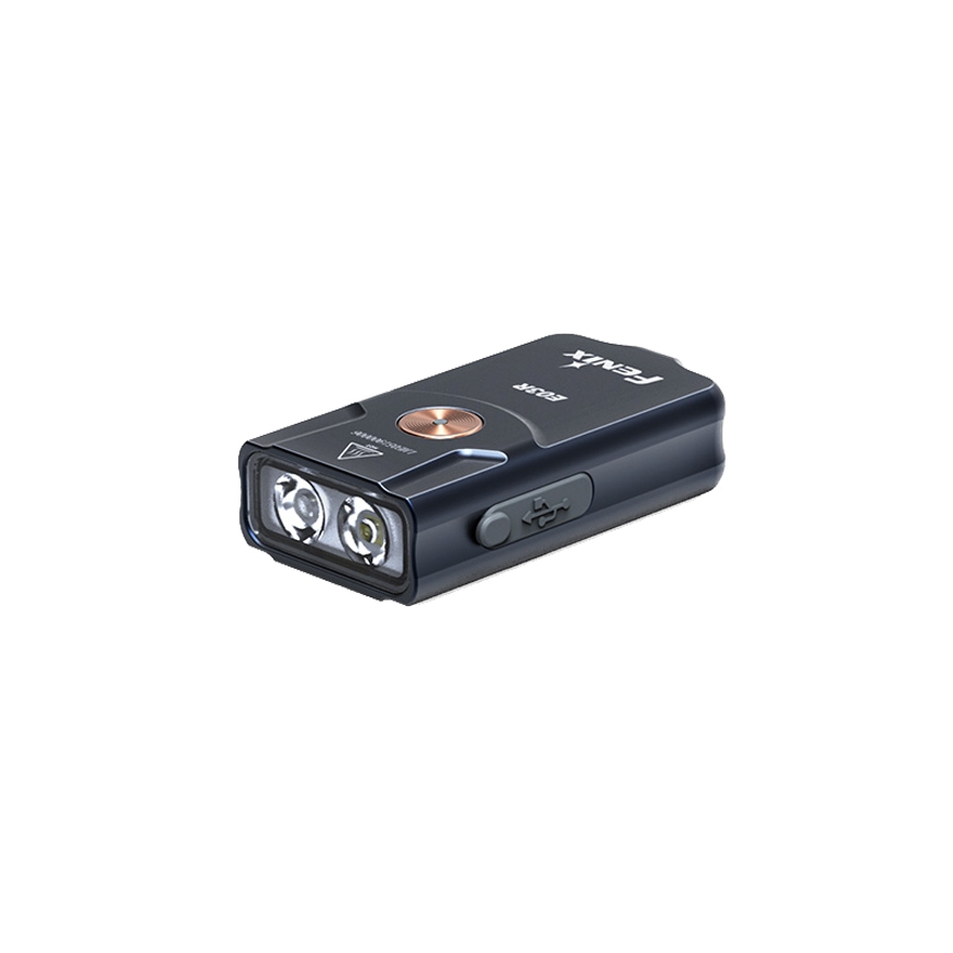 Latarka FENIX E03R - niewielkich rozmiarów, ładowna latarka w formie prostokątnego breloka, który można dopiąć do kluczy. E03R posiada 2 diody: czerwoną i białą, wbudowany akumulator oraz funkcję szybkiego ładowania za pośrednictwem portu USB-C. Maksymalny strumień światła wynosi 260 lumenów, co jest niespotykane w tak małych latarkach.