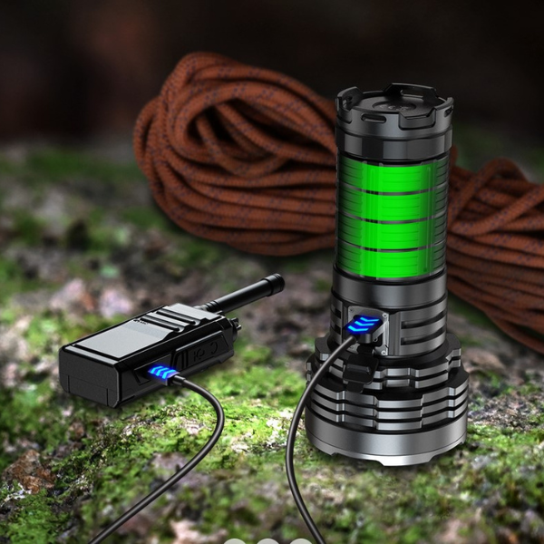 Wbudowany akumulator o pojemności 15 000 mAh zapewnia długotrwałe działanie — ponad tydzień w trybie eco (10 lumenów) lub 150 minut w trybie turbo (15 000 lumenów). Dzięki portowi USB-C z obsługą szybkiego ładowania QC2.0, pełne naładowanie akumulatora zajmuje zaledwie 4 godziny. Latarka może również służyć jako power bank do ładowania innych urządzeń.