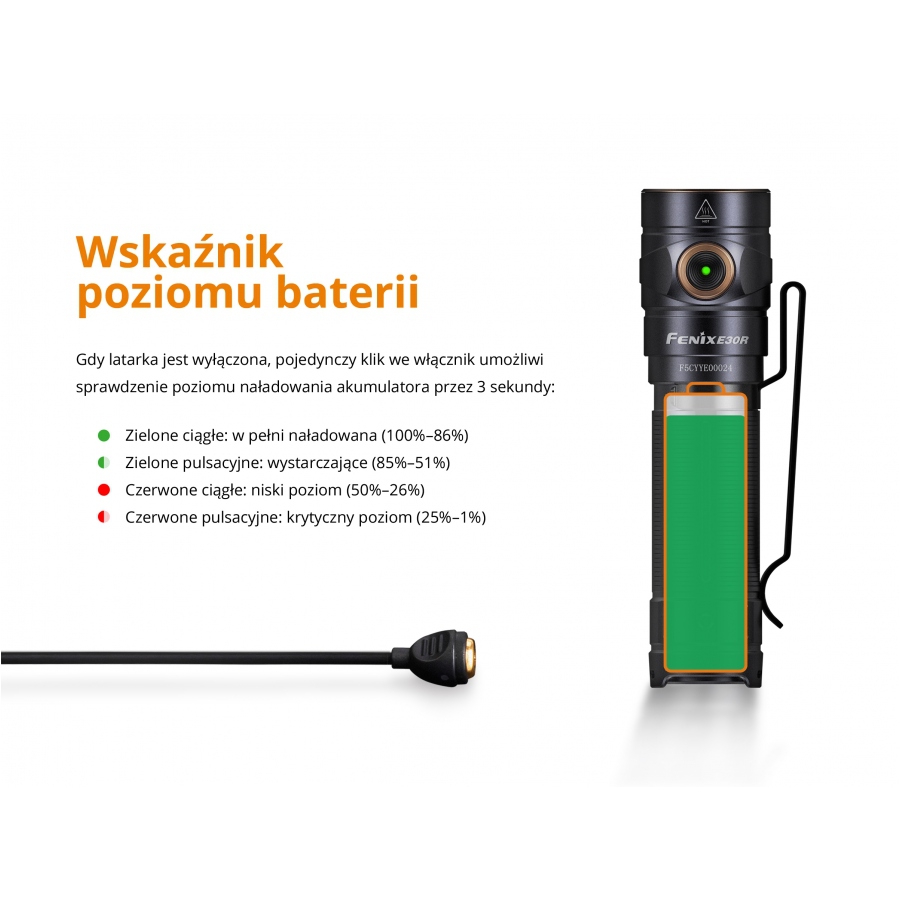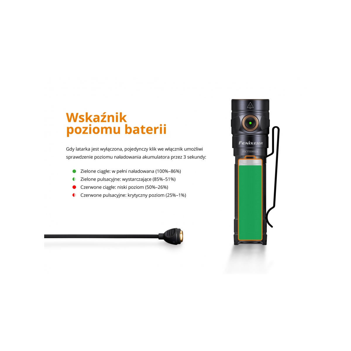 Latarka FENIX E30R - kompaktowa ładowalna latarka do użytku codziennego. Wyposażona została w diodę LUMINUS SST40 o mocy 1600 lumenów.