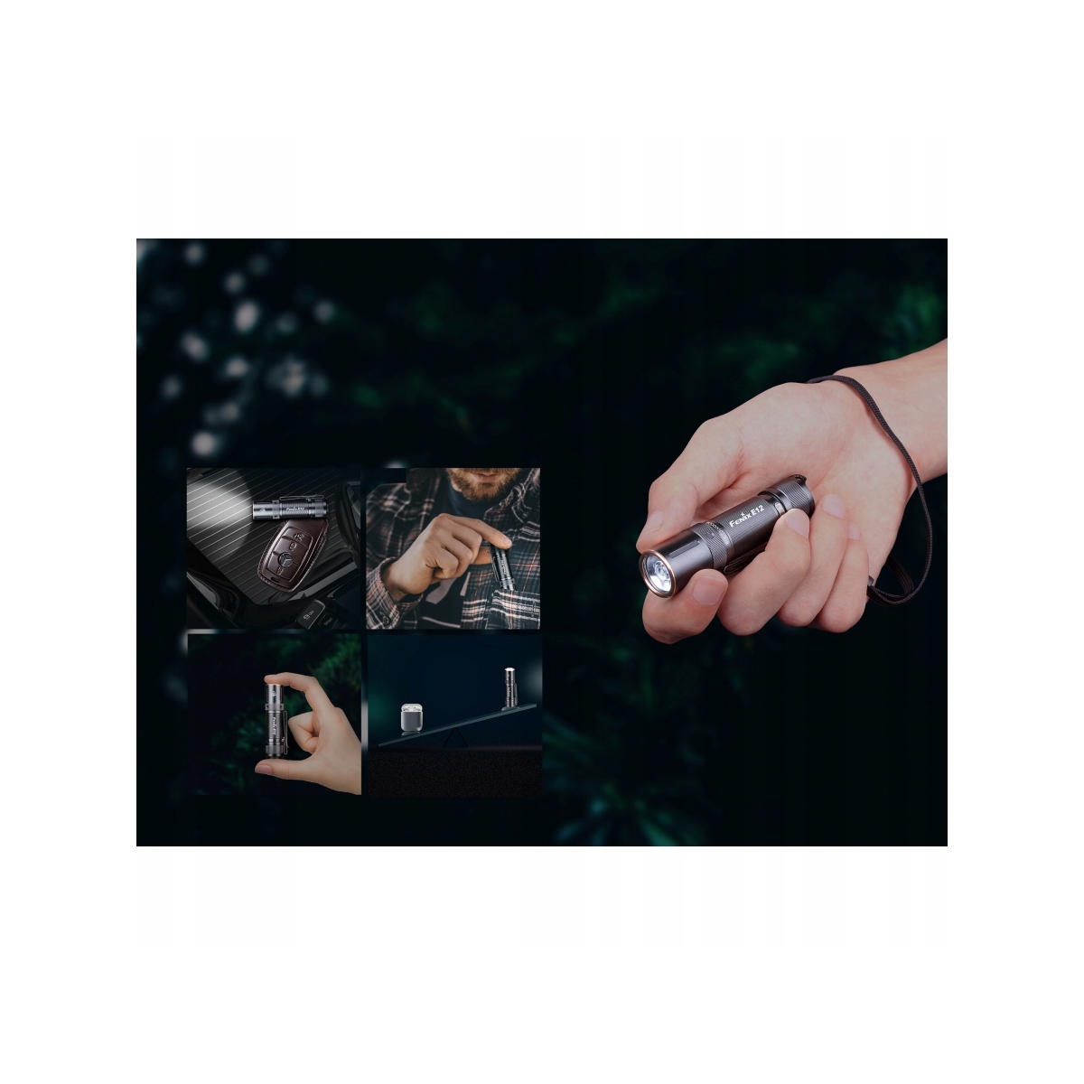 - Korpus latarki Fenix E1 V2.0 wykonano z hartowanego aluminium, poddanego procesowi twardego anodowania HA-III, dzięki czemu tubus i głowica latarki są odporne na zarysowania, wytarcie i uszkodzenia mechaniczne.