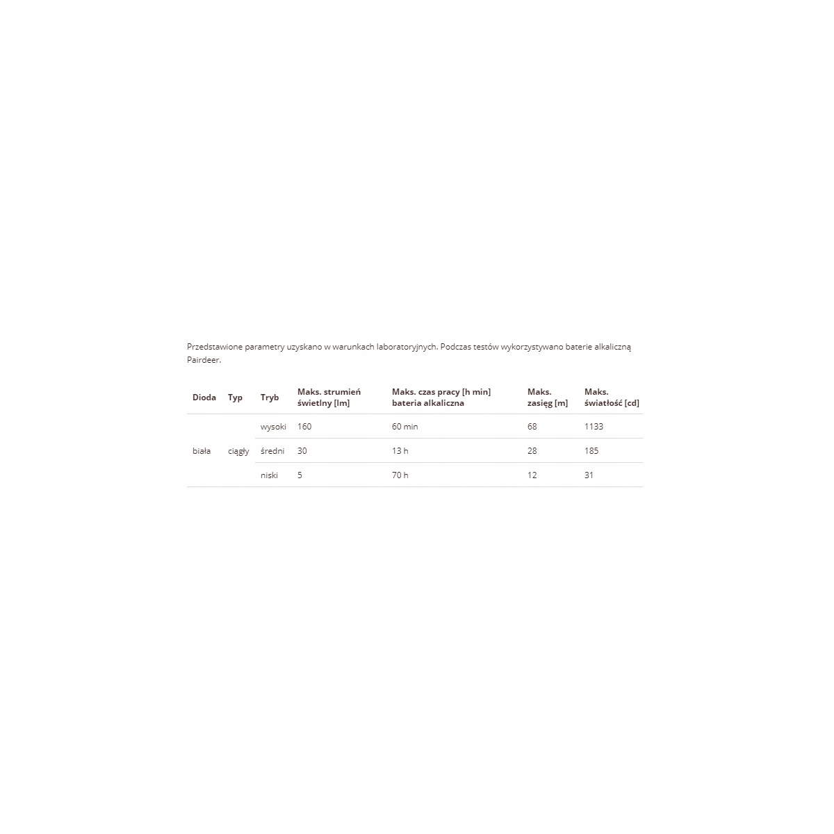 Użytkownik ma do dyspozycji 3 tryby światła: niski, średni i wysoki. W trybie wysokim latarka może pracować do 60 minut, w trybie niskim 5 lumenów nawet do 70 godzin!