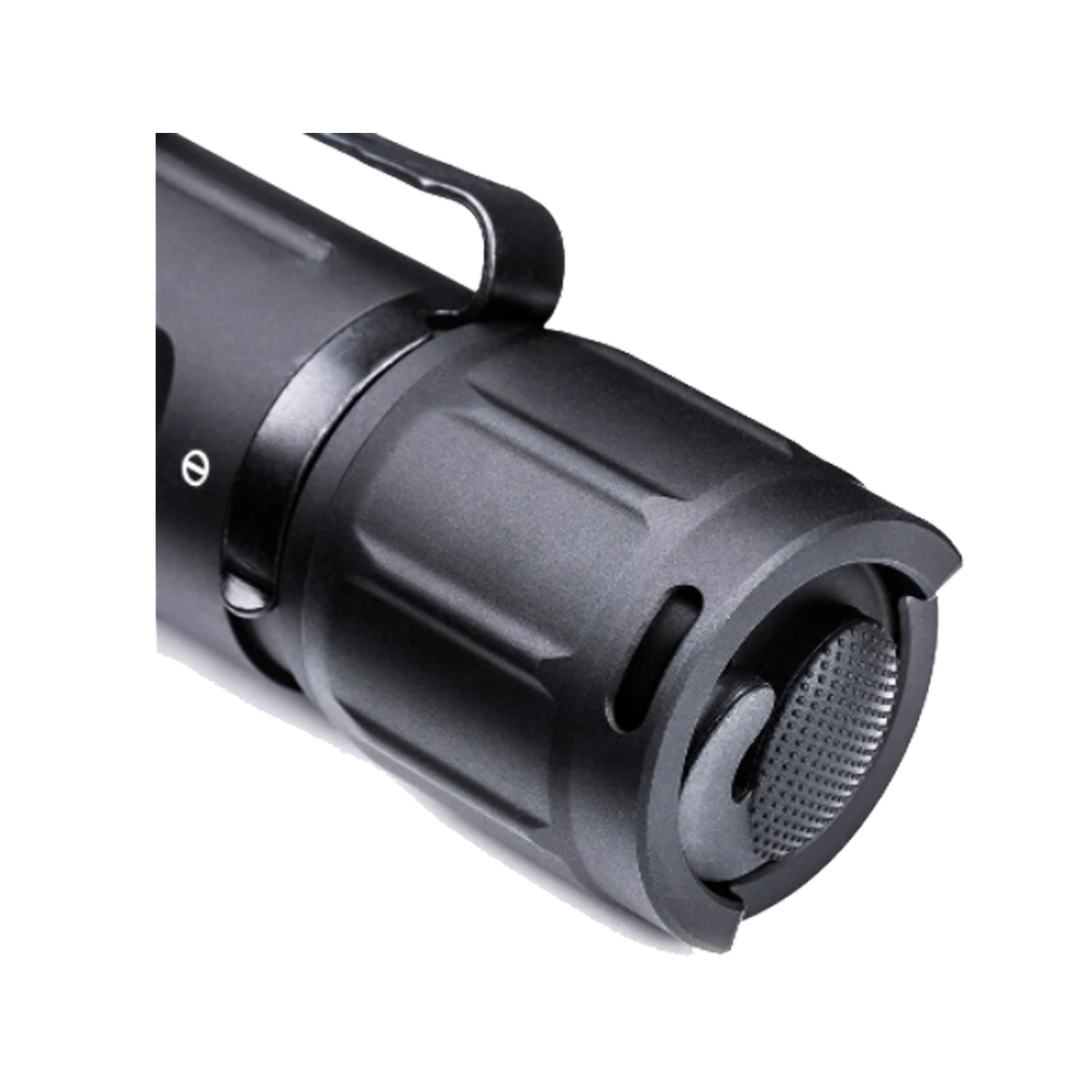 - Latarka posiada zdejmowany stalowy klips oraz pasek na rękę zaczepiany o otwór umieszczony na końcu tubusu.