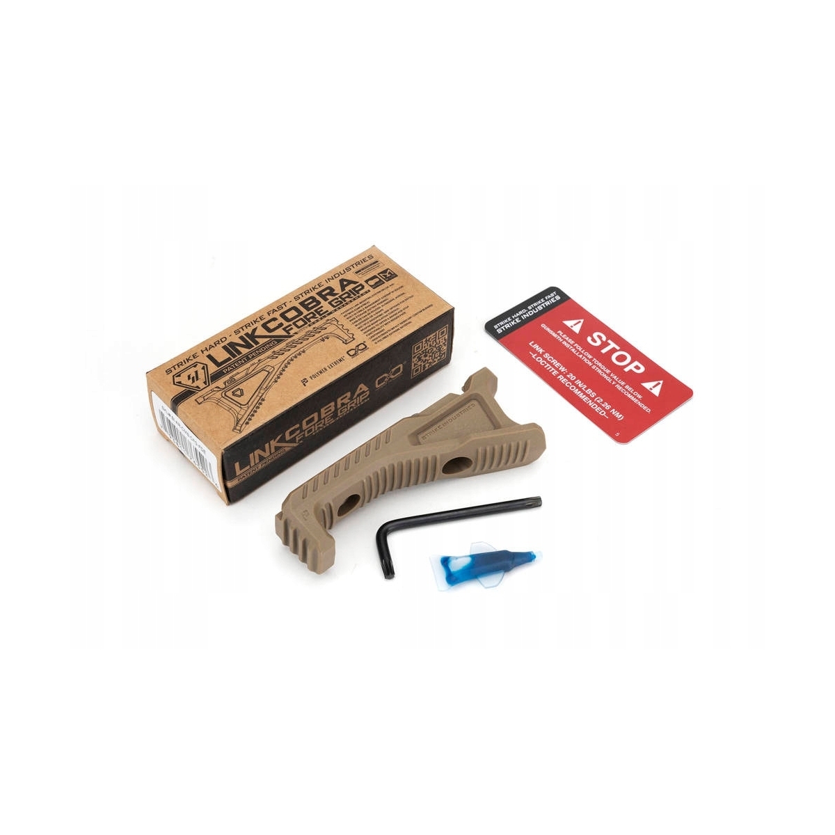 Chwyt przedni STRIKE INDUSTRIES LINK Cobra SI-AR-CMS-CFG-FDE - przystosowany do montowania na łożach w standardzie M-LOK lub KeyMod, wykonany przez firmę Strike Industries. Podczas jego projektowania producent wziął pod uwagę opinie wielu weteranów i aktywnych żołnierzy oraz najlepsze światowe rozwiązania. Chwyt może być także zamontowany przodem lub tyłem. Pozwala na różnorodne trzymanie broni, zależnie od preferencji jej użytkownika.