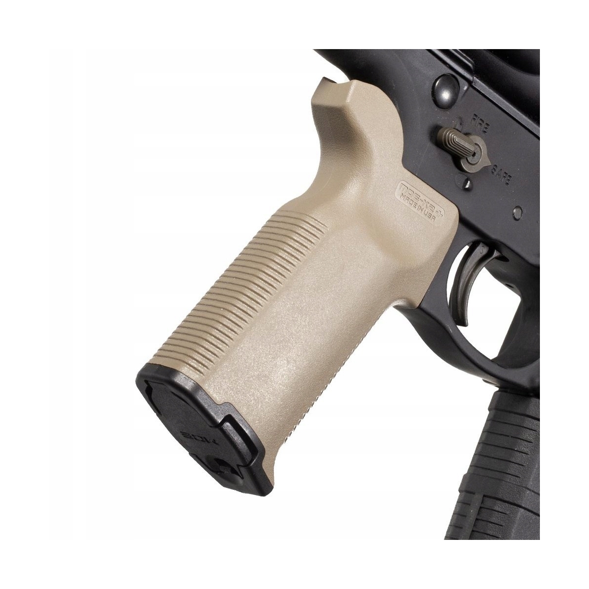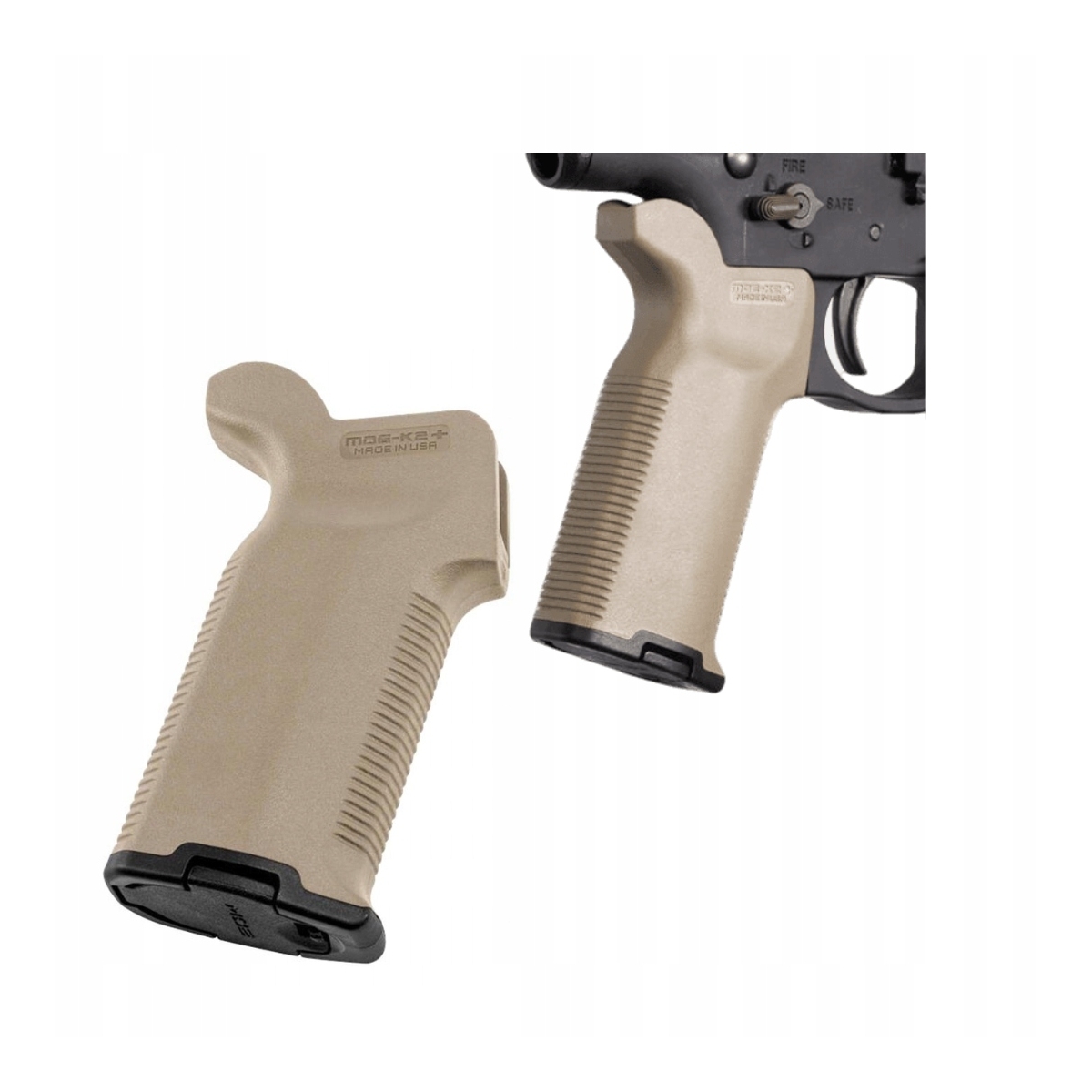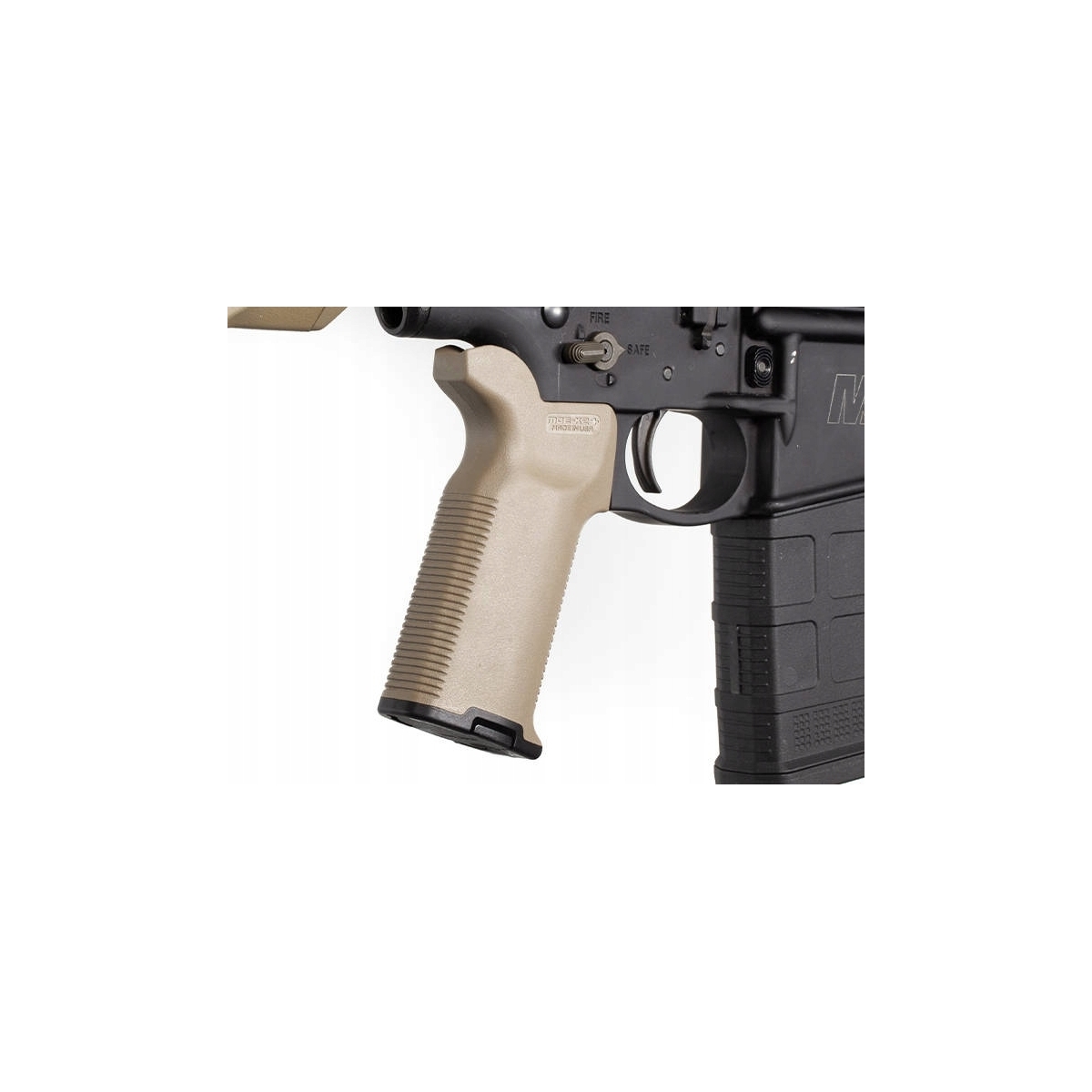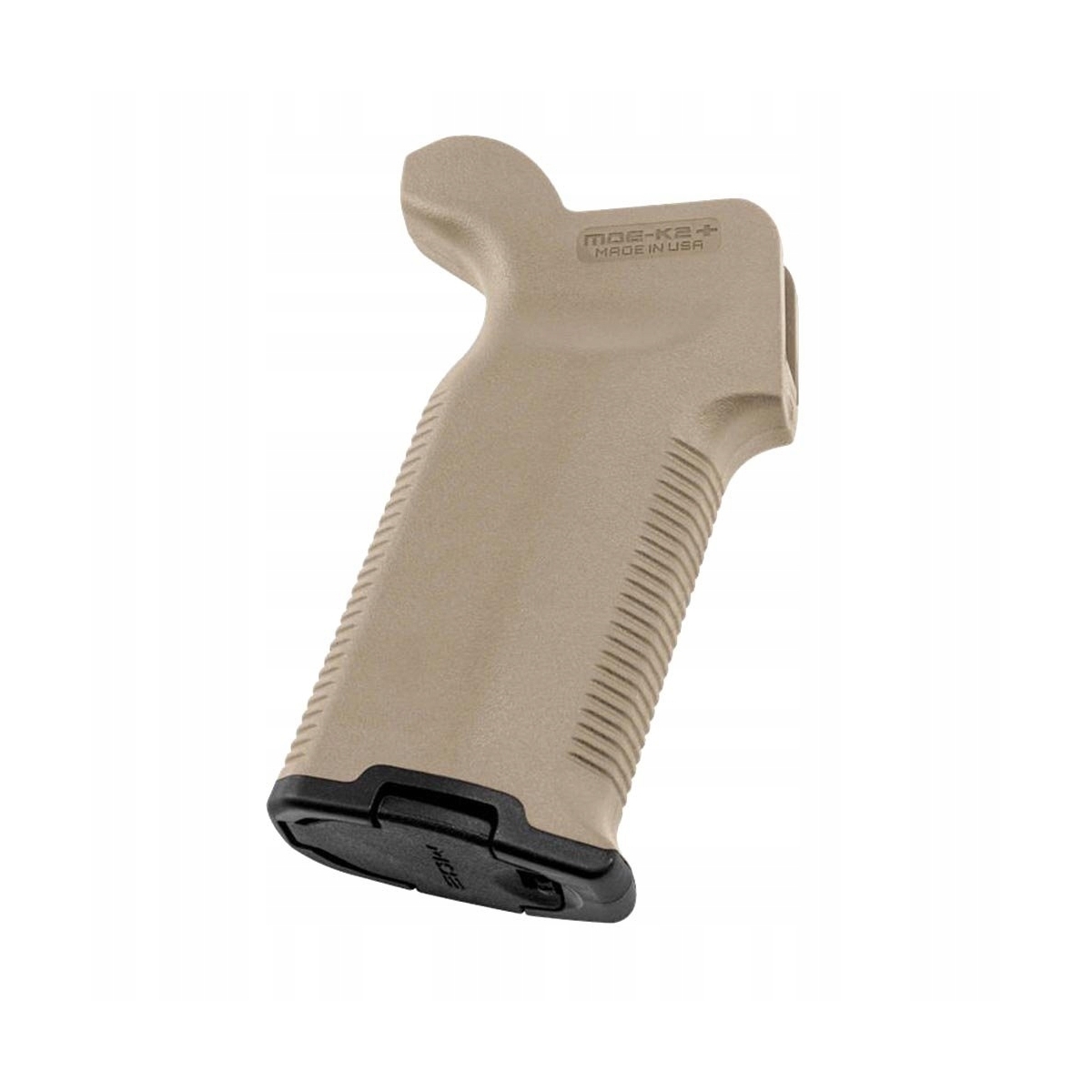 Magpul MOE-K2+ Grip do AR15 / M4 FDE - to pełnowymiarowy chwyt pistoletowy ze zmniejszonym stosunkiem kąta nachylenia wobec komory spustowej do standardowych. Idealnie dopasowany do karabinków AR15 w kompaktowych konfiguracjach, o krótkim LOP.