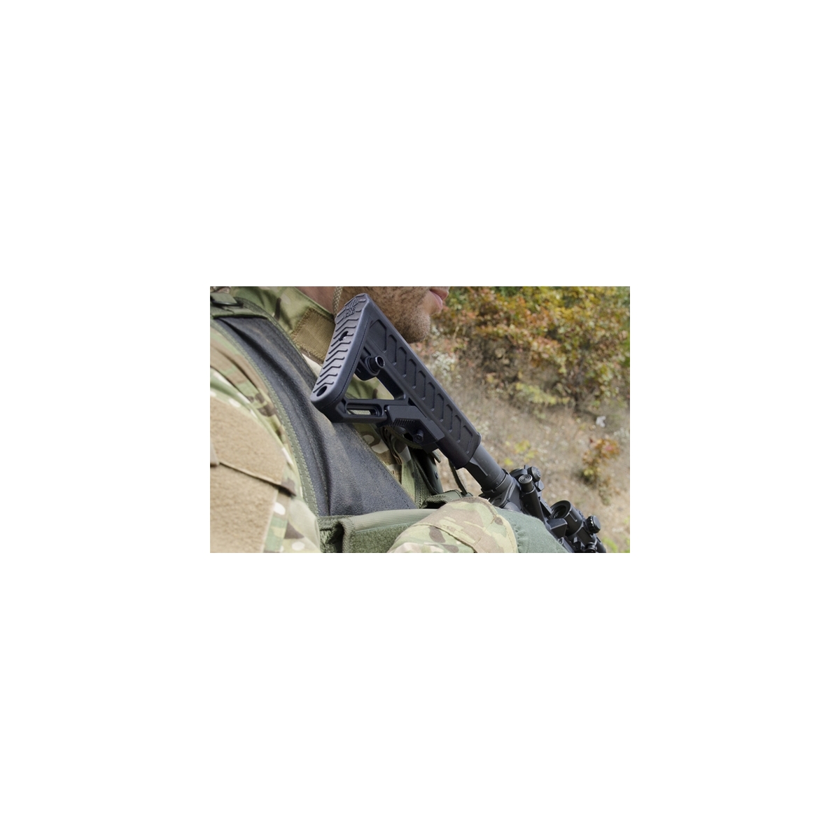 Sprężynujący przycisk blokady położenia (6 pozycji) schowano w obrębie szkieletu, co zapobiega jego przypadkowemu wciśnięciu. W tylnej części kolby znajdują się dwustronne gniazdo QD oraz zaczep do mocowania pasa nośnego.
