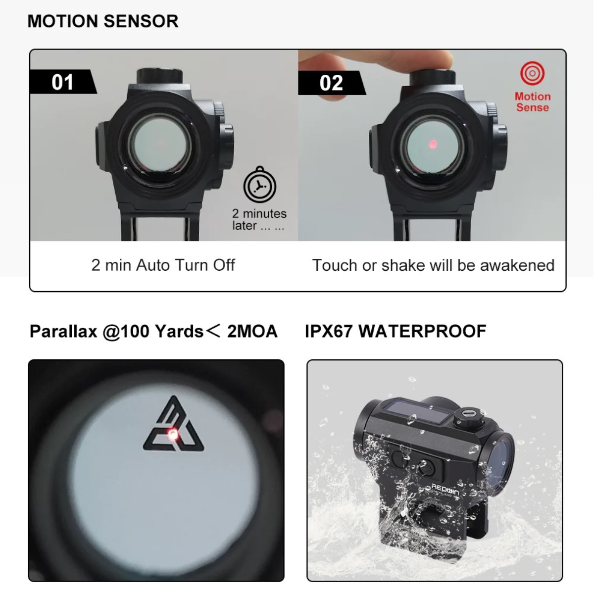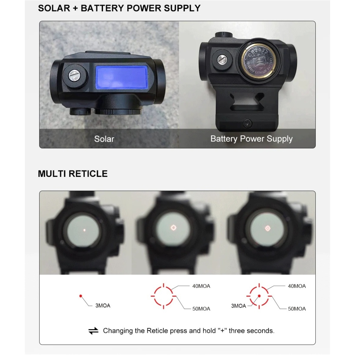 ⭐ 10 poziomów intensywności czerwonej kropki (8 poziomów światła dziennego + 2 poziomy widzenia w nocy)