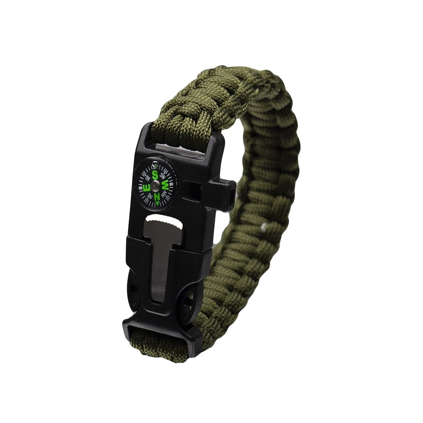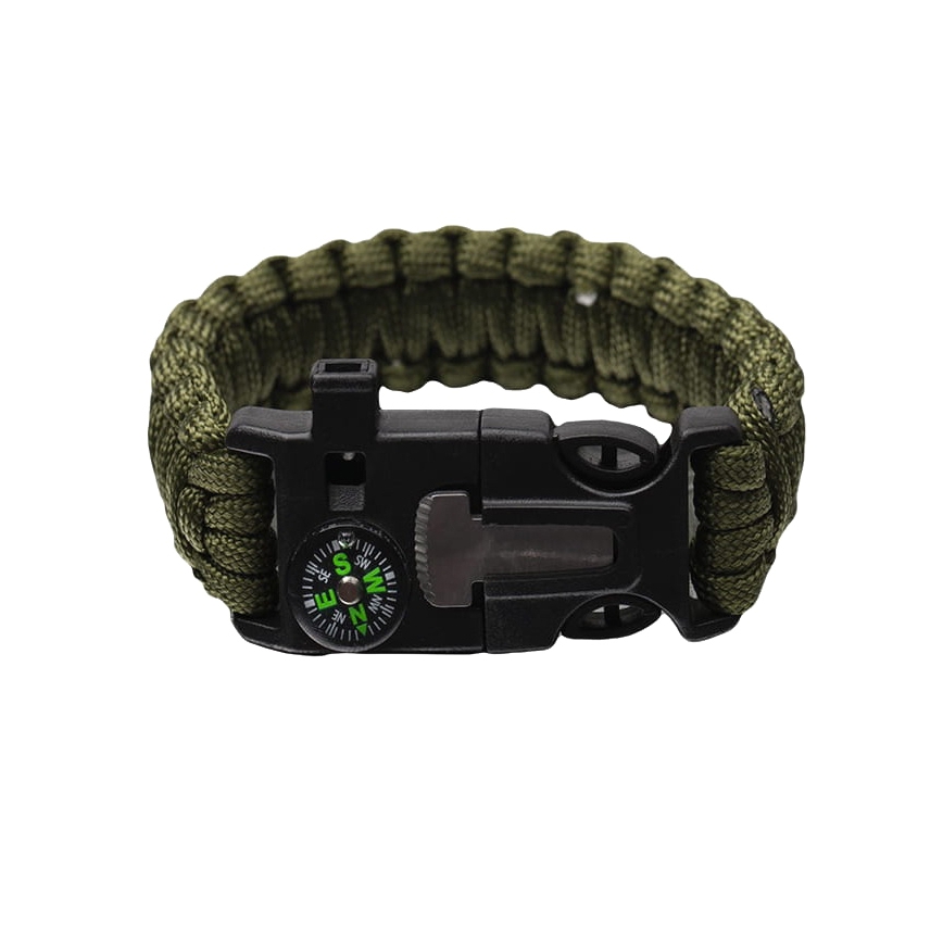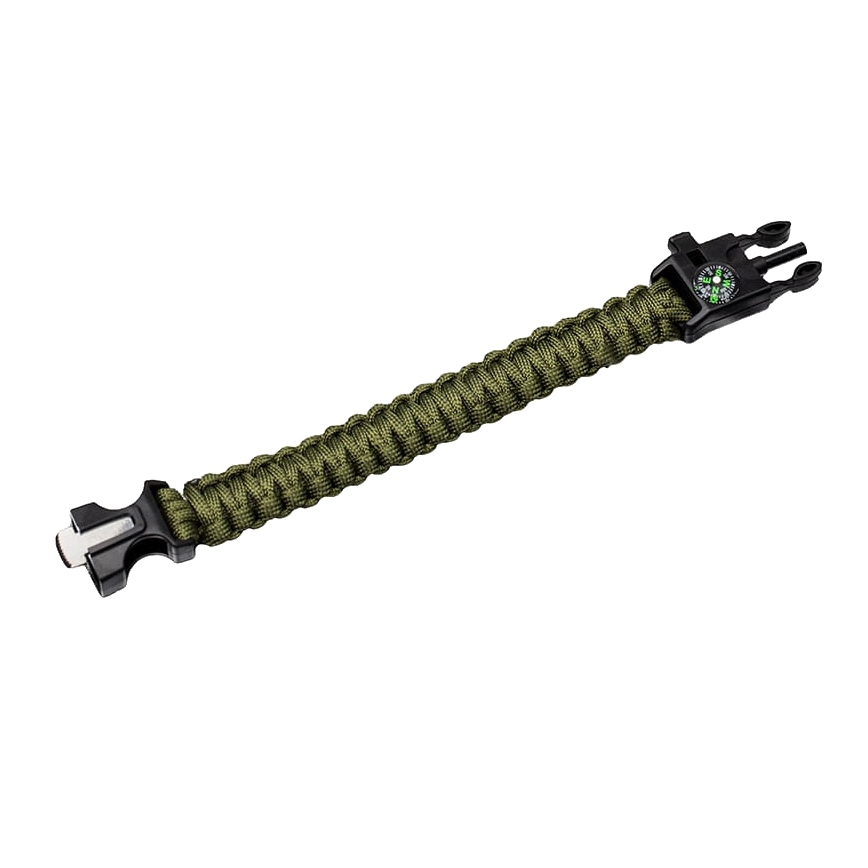 Bransoleta survivalowa Paracord Olive z krzesiwem, gwizdkiem i kompasem