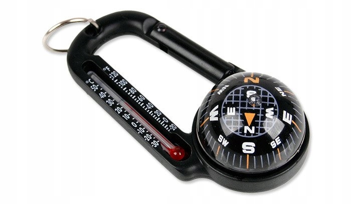 Kompas Survivalowy FOSCO - turystyczny karabinek z wbudowanym kompasem oraz termometrem firmy Fosco. Wyposażony w tarczę, która dzięki umieszczeniu w płynie posiada zmniejszone opory ruchu i precyzyjniej wyznacza kierunek.
