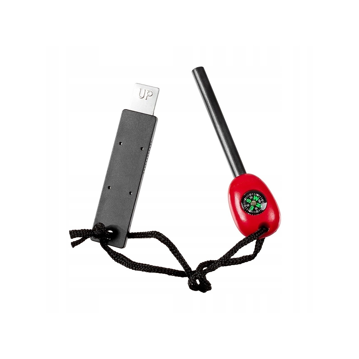 Zestaw zawiera krzesiwo oraz specjalną stalową blaszkę (iskrownik) do inicjowania iskier. Całość zamieszczona jest na sznurku. Czerwony kolor obudowy ułatwia znalezienie krzesiwa w warunkach słabego oświetlenia lub złej pogody.