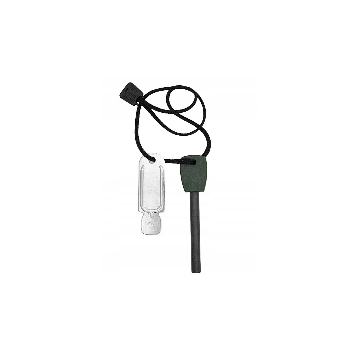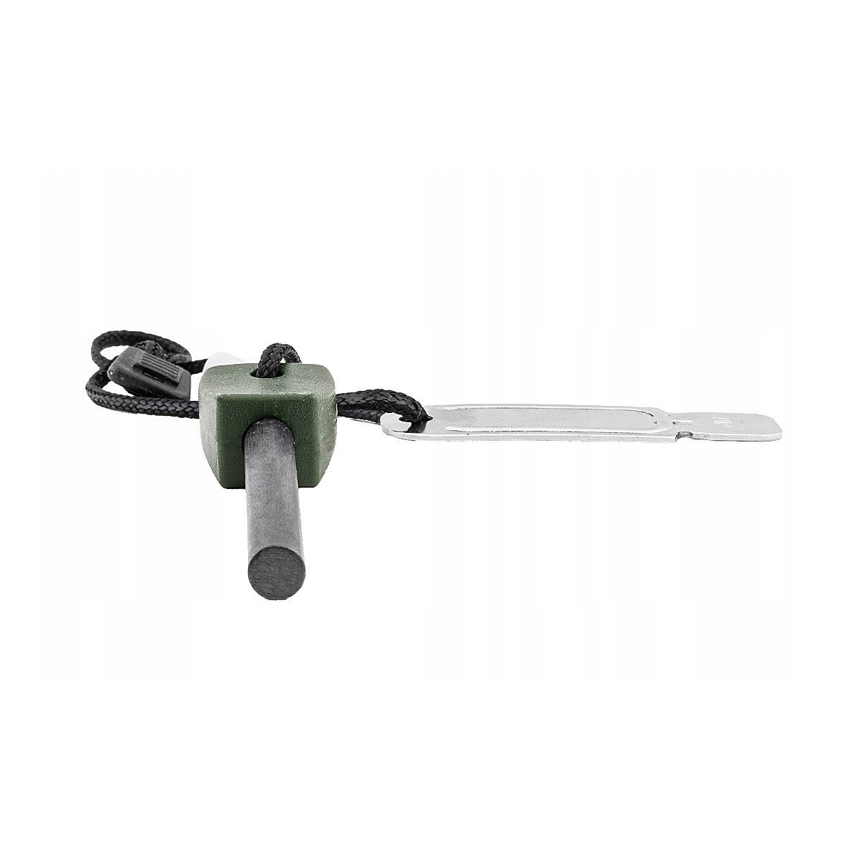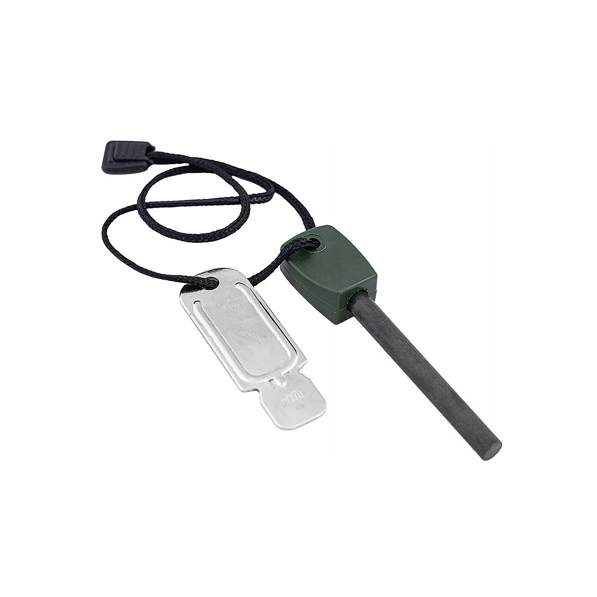 Dodatkowo krzesiwo i blaszka połączone są sznurkiem, dzięki czemu można zawiesić je na smyczy lub jako brelok.