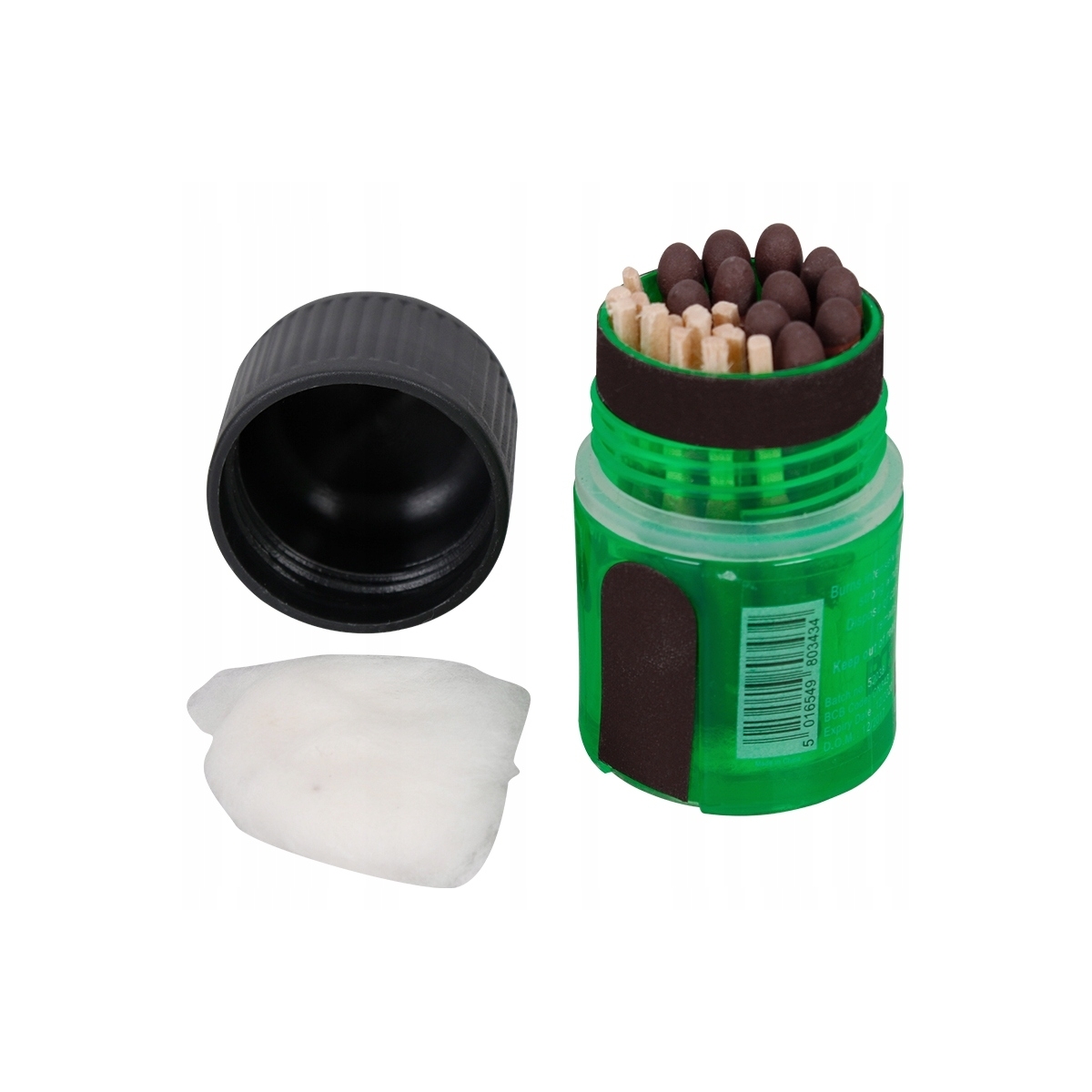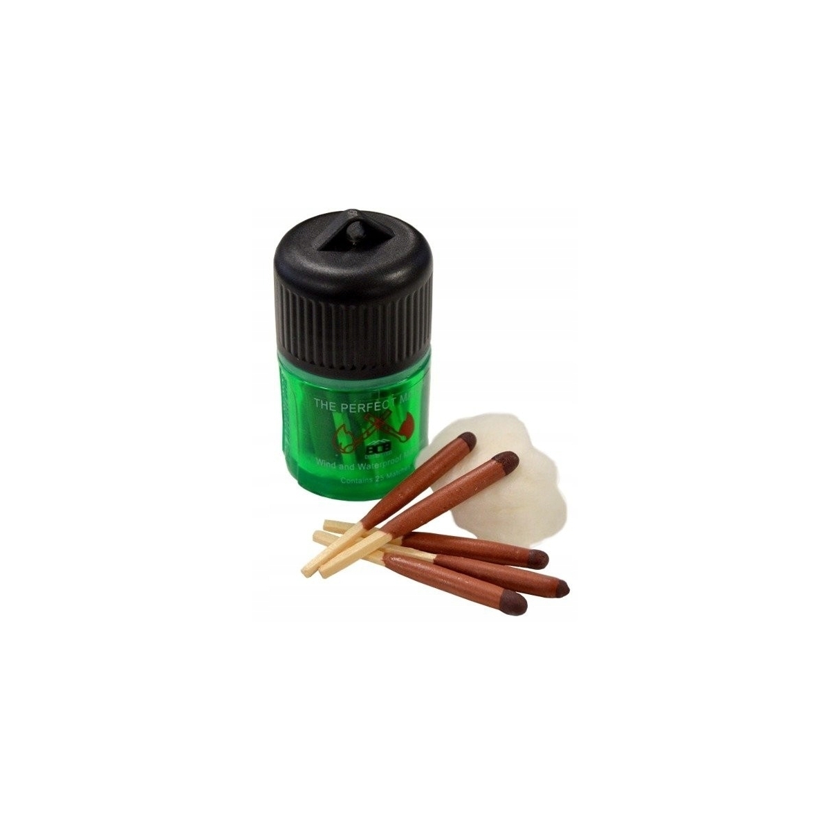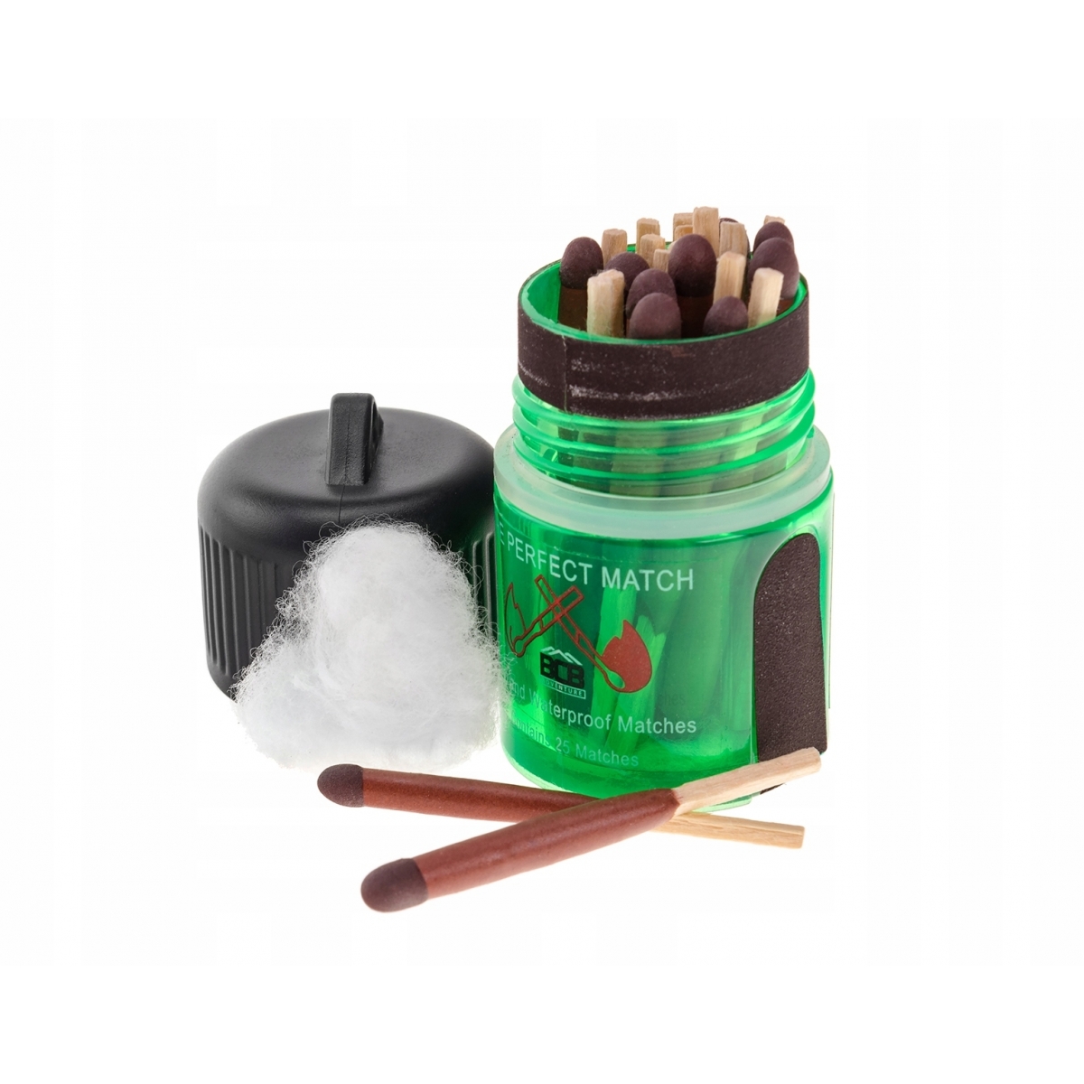 W zestawie znajduje się 25 zapałek, które zapakowano w wodoodporne opakowanie. Na pudełku znajdują się 3 draski, w tym 1 zlokalizowana pod nakrętką, dzięki czemu jest dodatkowo chroniona przed wilgocią. Opakowanie jest przeźroczyste, co umożliwia łatwe i szybkie sprawdzenie ilości pozostałych zapałek.