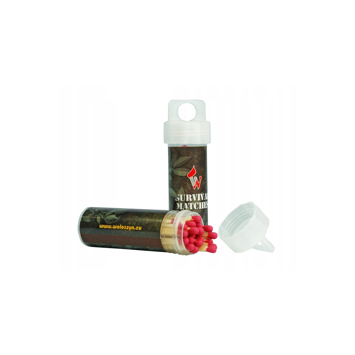 Zapałki surwiwalowe- komplet 20 zapałek, które można odpalić od każdej szorstkiej powierzchni. Zapałki zamknięte są w szczelnym plastikowym pudełku. Za zewnątrz pojemnika znajduję się potarka, umożliwiająca szybki zapłon zapałki.