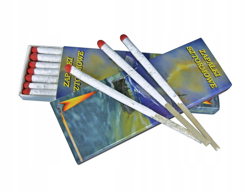 Zapałki sztormowe- komplet ośmiu zapałek sztormowych, które nie zgasną nawet przy najmocniejszym wietrze. Niezbędne podczas wichury oraz silnego wiatru.