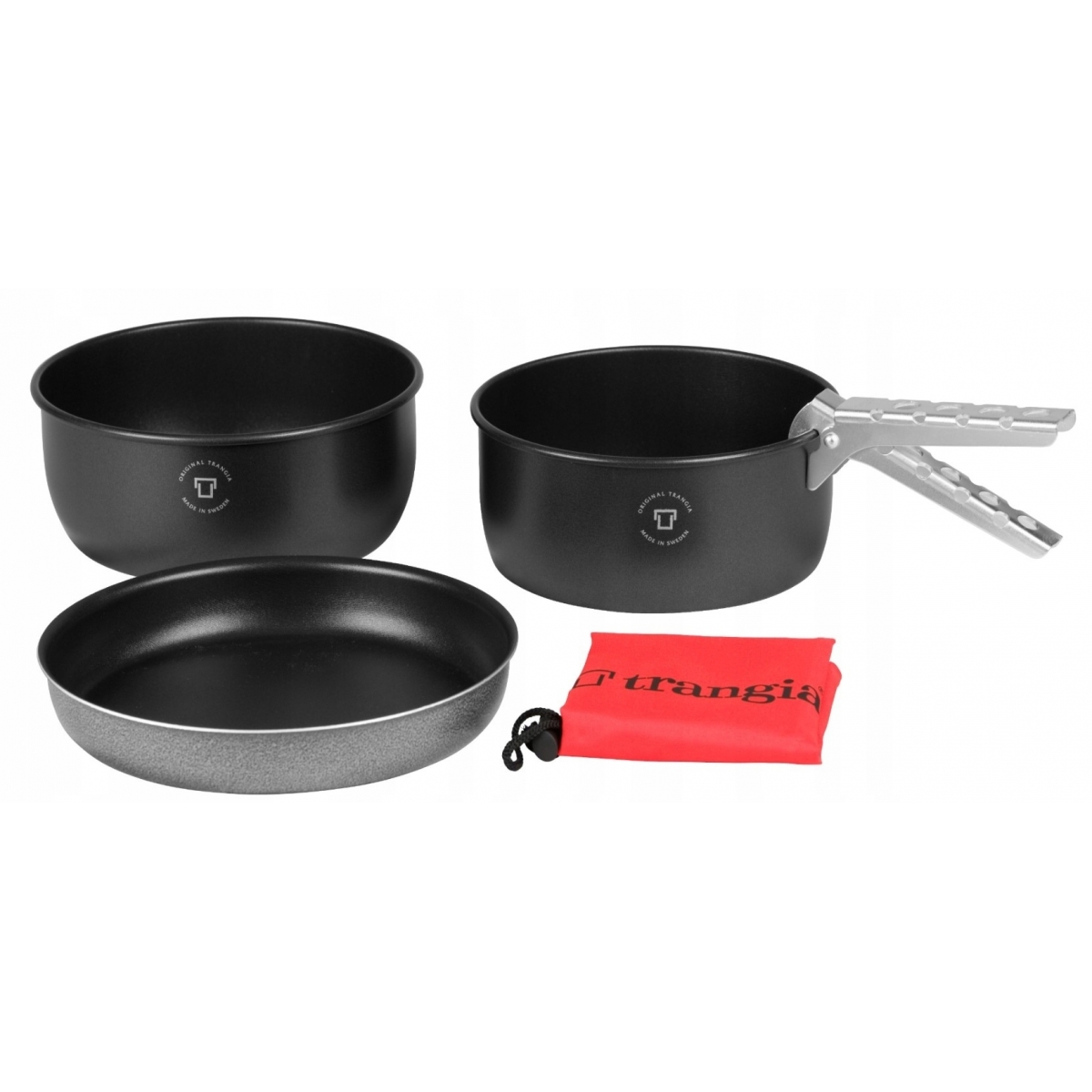 Trangia Camping Set Tundra I to praktyczny zestaw do gotowania składający się z dwóch garnków o pojemności 1,5 L i 1,75 L, patelni o średnicy 20 cm, uchwytu oraz worka transportowego.