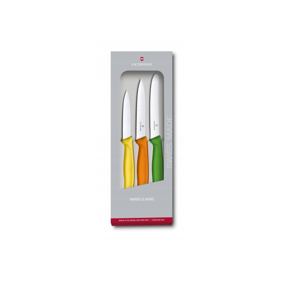 Zestaw noży kuchennych Victorinox - do warzyw i owoców Swiss Classic. Ząbkowana krawędź ostrza ułatwia krojenie zarówno twardych, jak i miękkich warzyw. Standardowe proste ostrze doskonale nadaje się do efektywnego cięcia małych owoców. Noże zapakowane zostały w pudełko upominkowe, dzięki temu będą one idealnym pomysłem na prezent.