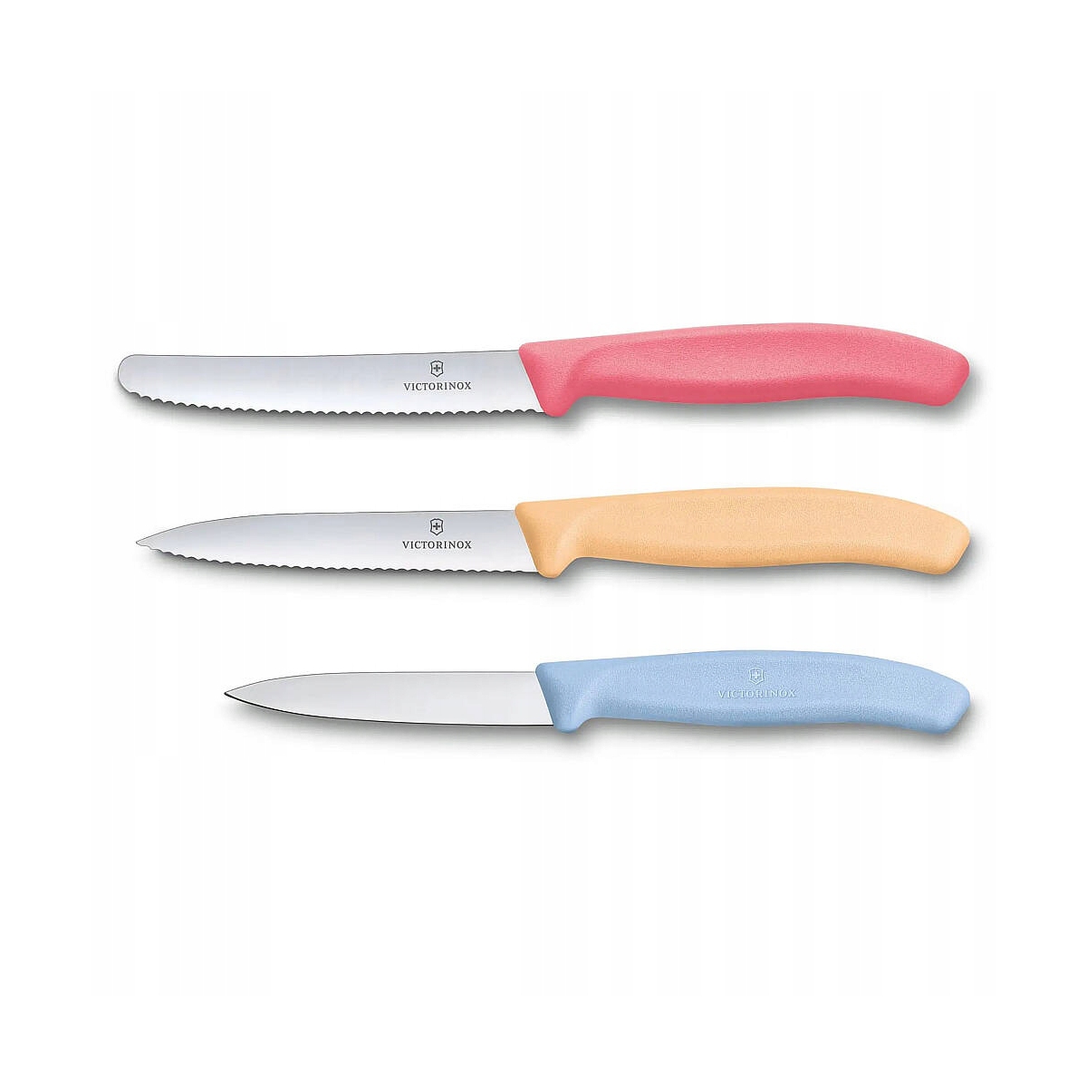 Komplet noży Victorinox 6.7116.34L1 to noże do warzyw i owoców – niezbędne w każdej kuchni. Ostrze mimo małych rozmiarów cechuje niezwykła praktyczność. Wyciąganie pestek z chili lub krojenie cukinii w kostkę, krojenie plasterków polędwicy lub limonki na przyjęcie – ten nóż kompaktowych rozmiarów poradzi sobie z każdym zadaniem. Trio zawiera noże w trzech rozmiarach (8-11 cm) w trzech kolorach tęczy.