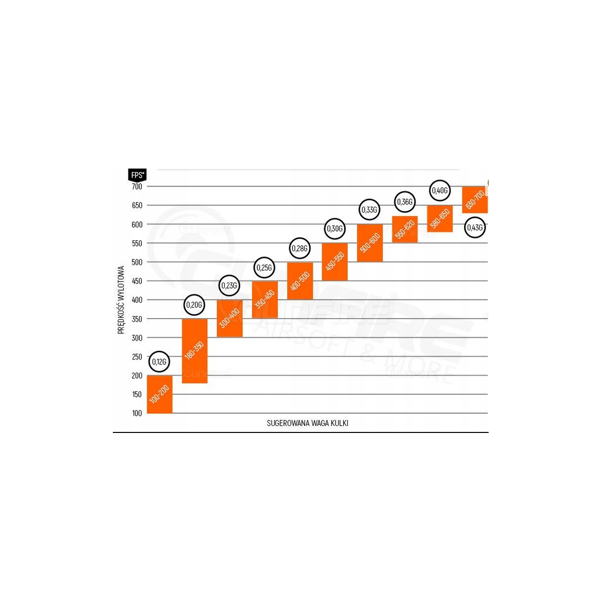 - Ich gładka, polerowana powierzchnia zapewnia doskonałą współpracę z systemami hop-up. Idealne rozłożenie środka ciężkości uzyskane dzięki specjalnemu procesowi postprodukcji gwarantuje wysoką powtarzalność oddawanych strzałów.
