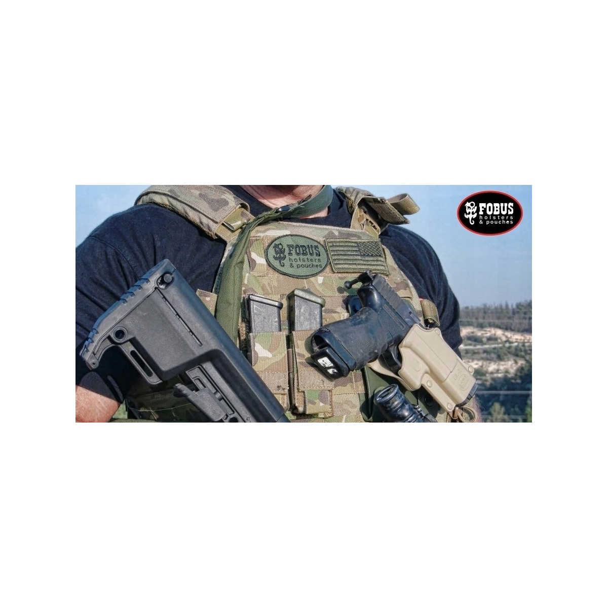 Kabura Fobus 6912ND RT - jest ładownicą na 2 magazynki. Wersja typu "płetwa" (wsuwana za pas). Wykonana ze specjalnego tworzywa, specjalnie zaprojektowane i wykonana metodą wtryskową. Modelu tego nie można skopiować w skórze, czy w innym materiale. Wyposażona w płetwę mocującą kaburę do brzegu spodni. Nie odstaje, nie przeszkadza w pozycji siedzącej.