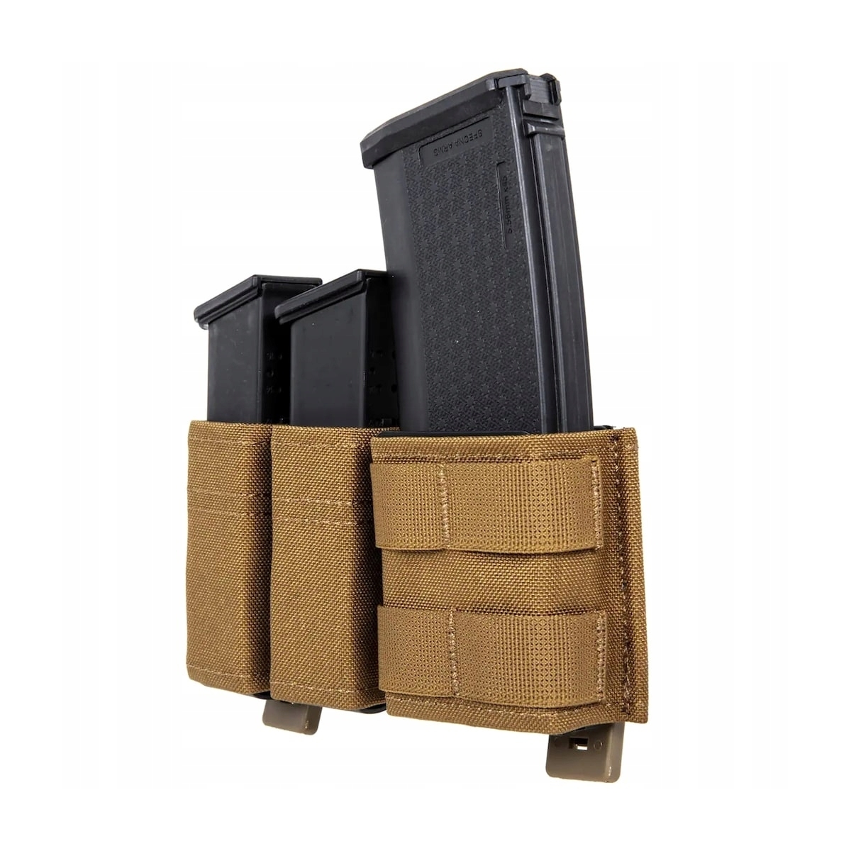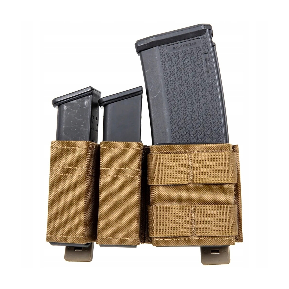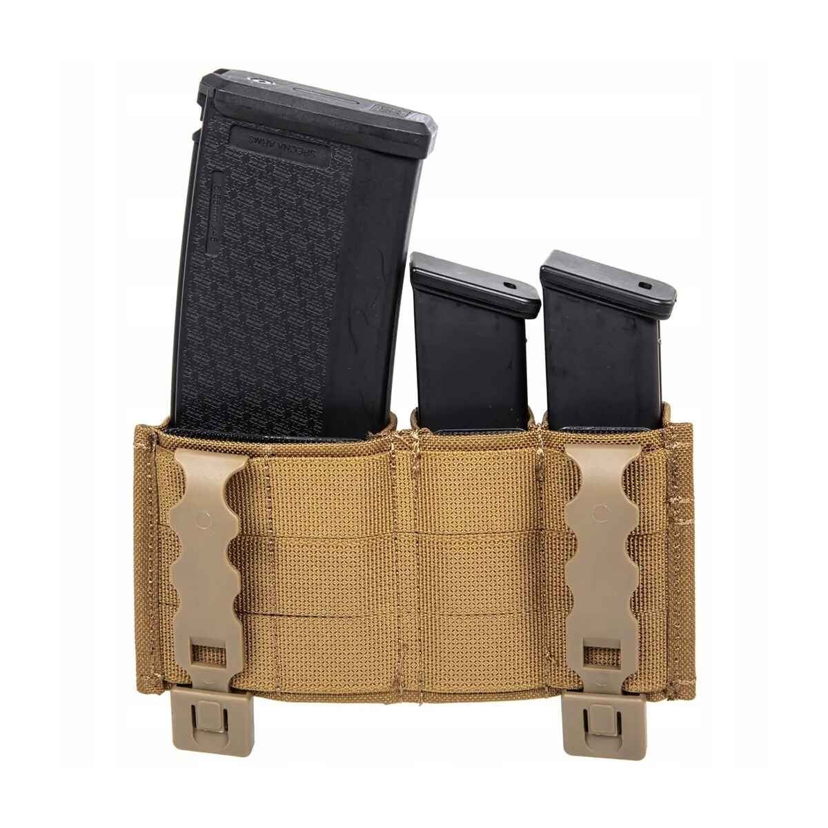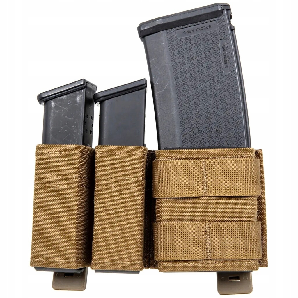 Potrójna ładownica typu fast do przenoszenia dwóch magazynków kal. 9 mm oraz jednego magazynka kal. 5.56 mm. Wykonana została z odpornej na uszkodzenia oraz przetarcia Cordury 500D.