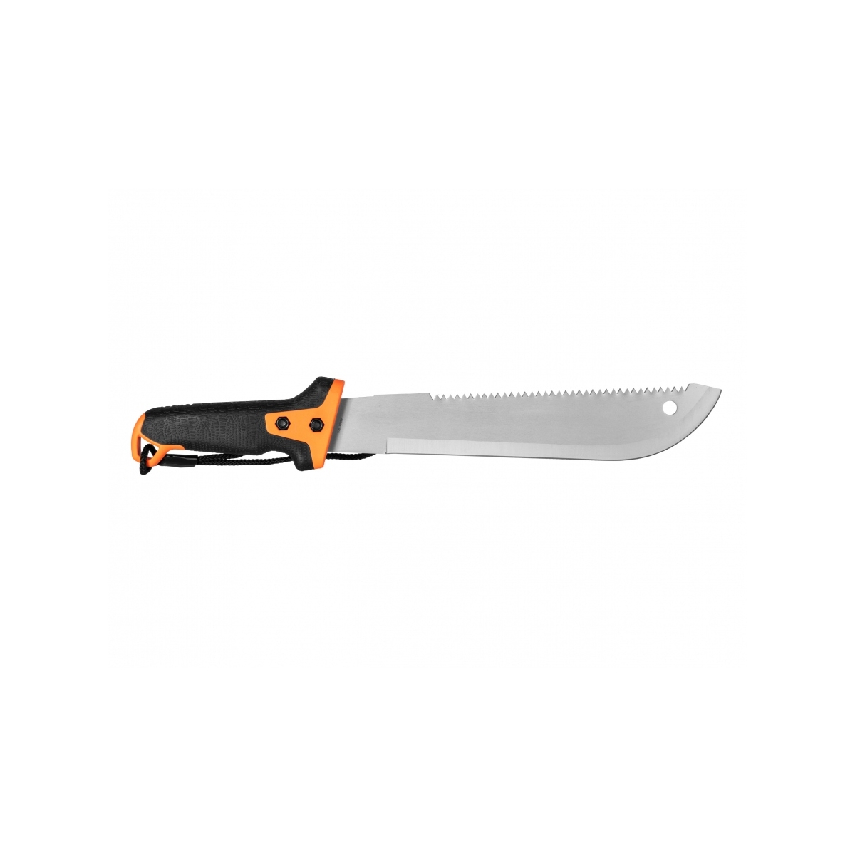 - Dzięki uniwersalnemu ostrzu i pile maczeta sprawdzi się na wyprawach survivalowych czy pracach w ogrodzie i na działce.