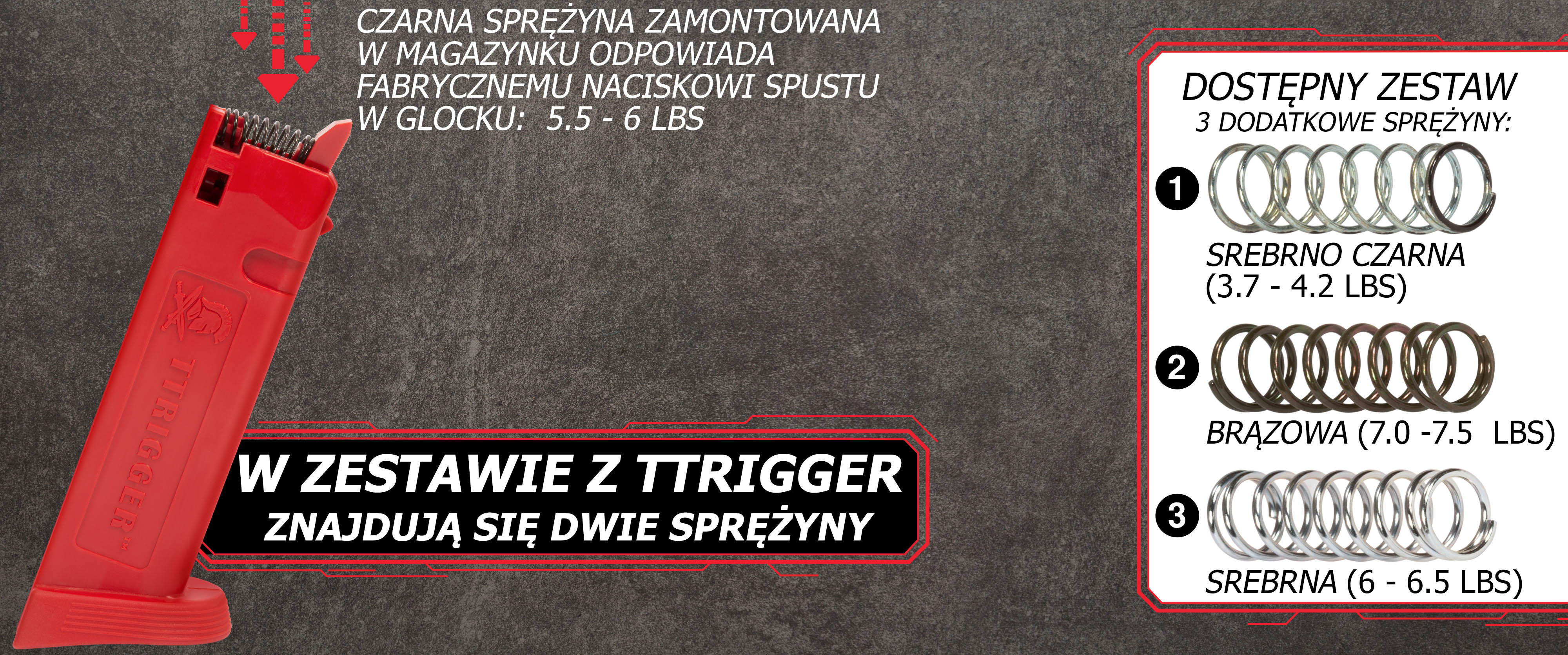 W zestawie z magazynkiem Ttrigger znajdują się dwie sprężyny, które odpowiadają za siłę z jaką należy wcisnąć spust. Czarna, zainstalowana w magazynku odpowiada standardowej twardości spustu Glocka, natomiast złota posiada zmniejszoną twardość.