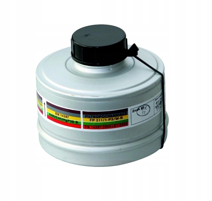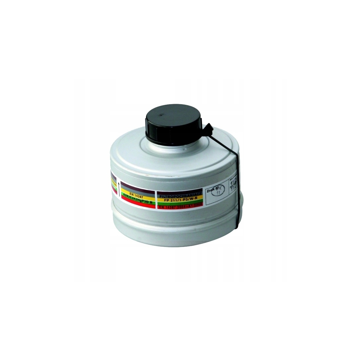 Filtr do maski przeciwgazowej FP 211/1-P3/W - Filtropochłaniacz po skompletowaniu z odpowiednią częścią wyposażoną w łącznik z gwintem Rd 40x1/7” (EN-148-1) służy do ochrony układu oddechowego przed związkami organicznymi, nieorganicznymi z wyjątkiem tlenku węgla, gazami i parami kwaśnymi amoniakiem i jego pochodnymi oraz parami rtęci.