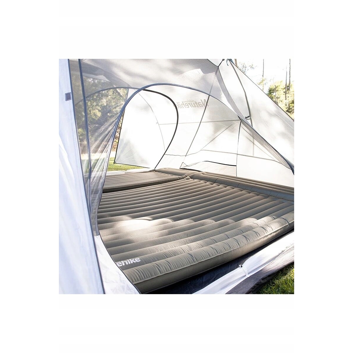 Materac wykonany jest z trwałej tkaniny 70D TPU Nylon, która jest odporna na wilgoć. Tworzy ona sieć komór powietrznych Air-Cell, odpowiedzialne są za komfort leżenia na materacu i dobre izolowanie od podłoża. Po nadmuchaniu w górnej części materaca powstaje grubszy przedział, który jest poduszką. Dzięki takiej konstrukcji nie musisz zabierać dodatkowo poduszki turystycznej.