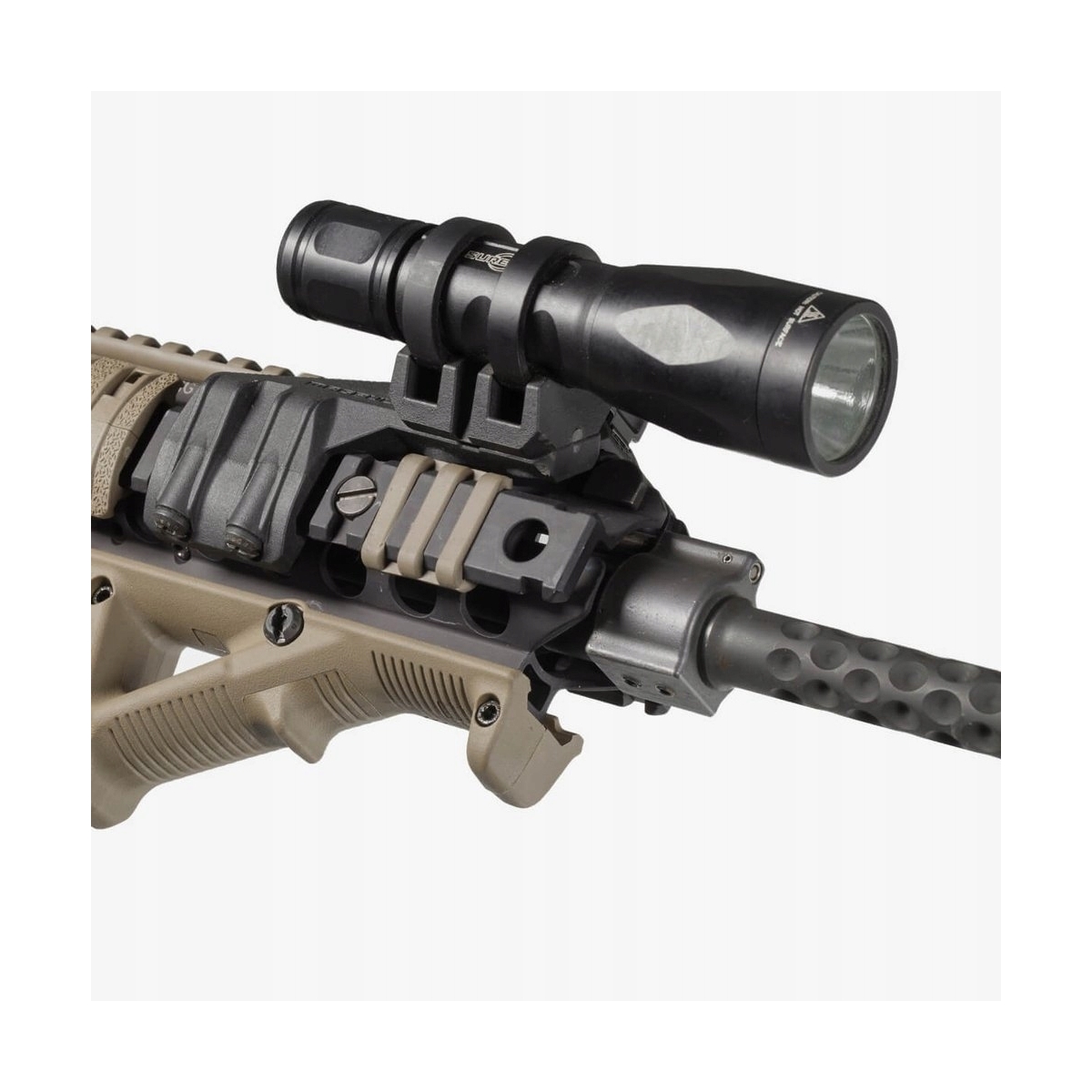 Wykonany z legendarnego, wzmocnionego polimeru Magpul, montaż jest praktycznie niezniszczalny, a jednocześnie lżejszy od swoich aluminiowych odpowiedników. Dzięki eliminacji ostrych krawędzi, montaż jest bezpieczny dla dłoni i nie niszczy pokrowców. Konstrukcja pozwala na bezpośredni montaż latarek z serii SureFire® Scout Light® oraz innych świateł o średnicy korpusu od 0,75 do 1,03 cala przy użyciu dołączonych pierścieni.