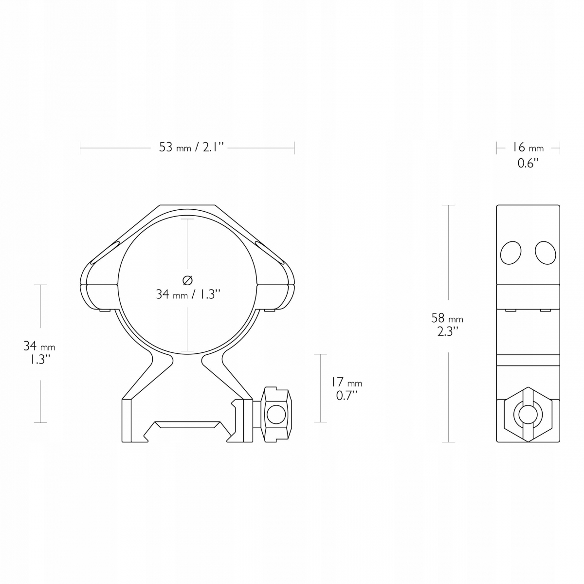 Hawke Precision Steel średni montaż lunety 34 mm to precyzyjny i trwały system montażowy stworzony do mocowania lunet celowniczych o tubusie o średnicy 34 mm na standardowej szynie Weaver. Ten średni montaż zapewnia optymalną wysokość podniesienia optyki, która pozwala wygodnie ustawić pozycję oka względem lunety, a jednocześnie nie jest tak wysoki, jak montaż taktyczny — co może być korzystne w konfiguracjach z mniejszymi lunetami lub przy zastosowaniu akcesoriów montowanych na lufie. Wysokość montażu (od szyny montażowej do dolnej wewnętrznej krawędzi pierścienia) wynosi 17 mm.