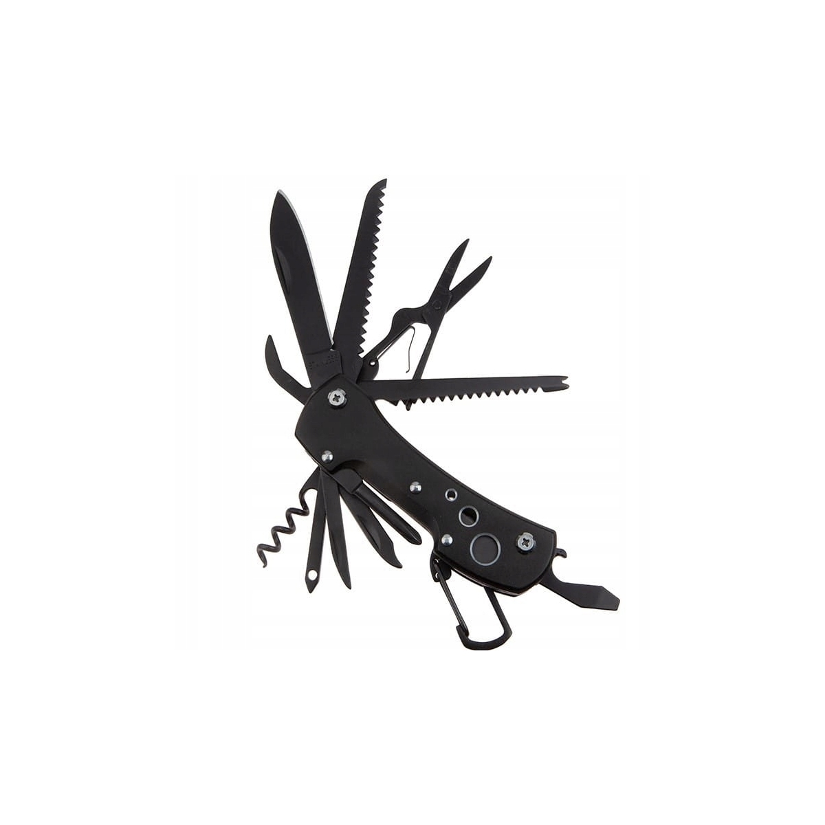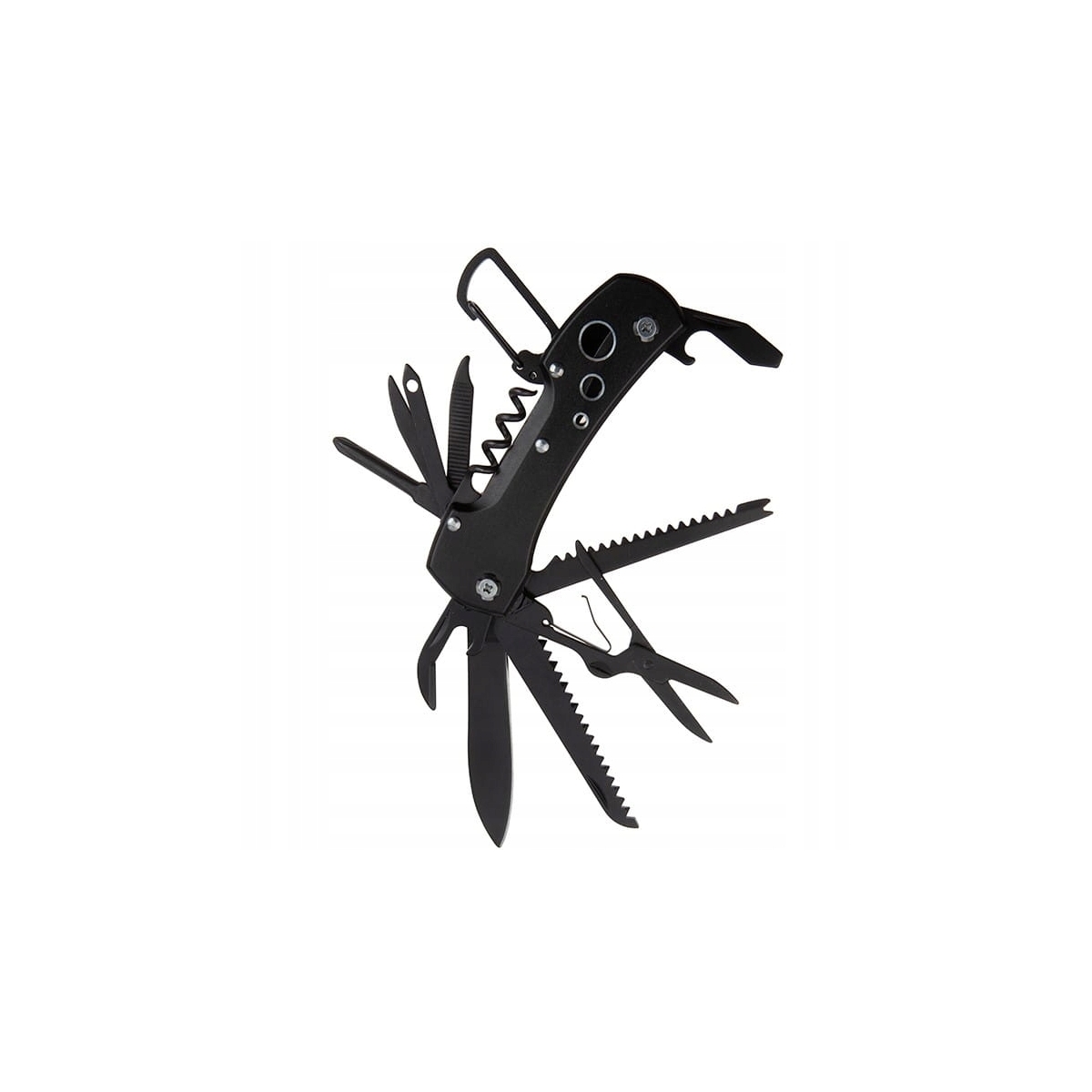 Dodatkowo został wyposażony w funkcjonalny karabińczyk umożliwiający przymocowanie go do szlufki lub innej części garderoby.Wyjątkowo ostra głownia oraz pozostałe narzędzia zostały wykonane ze stali nierdzewnej typu 420.Materiał ten jest wytrzymały na uszkodzenia i posiada wysokie właściwości antykorozyjne.Dodatkowo został pokryty czarną oksydą eliminującą problem niepożądanego odblasku.