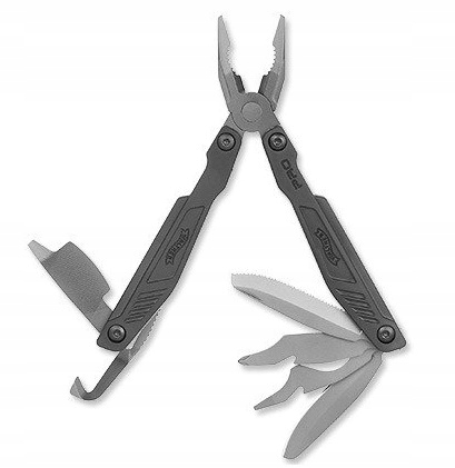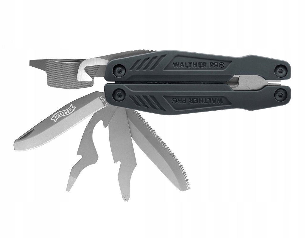 Multitool WALTHER Tool Tac Pro M 5.1991 12 w 1 - wykonany ze stali nierdzewnej 12c27 Sandvik. Model w rozmiarze M posiada 12 przydatnych narzędzi. Okładki wykonane z tworzywa G-10 pokrytego antypoślizgową gumą, dzięki której nie wyślizguje się z ręki. Kleszcze wykonane z kutej na zimno stali, posiadają siłę ścisku do 90 kg.