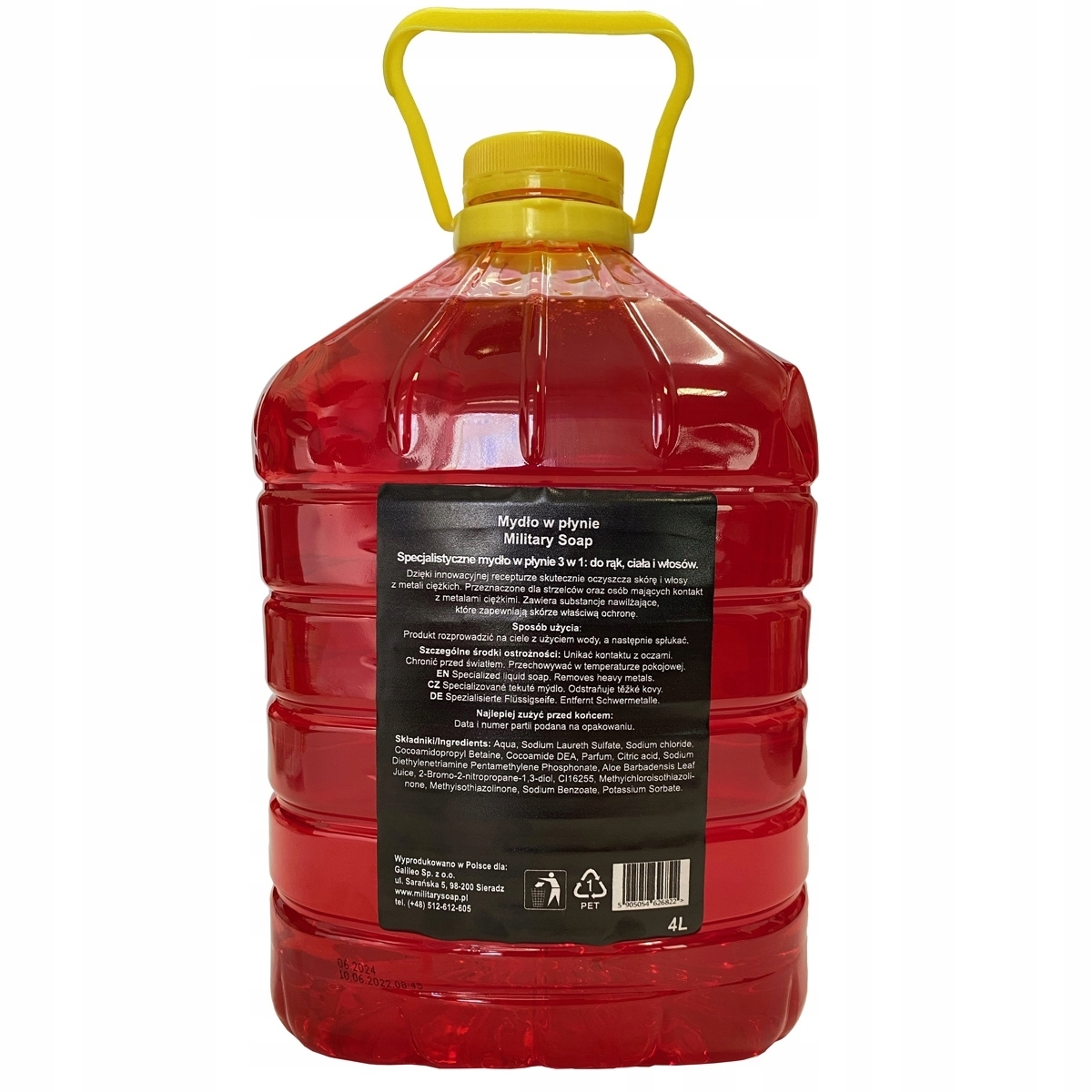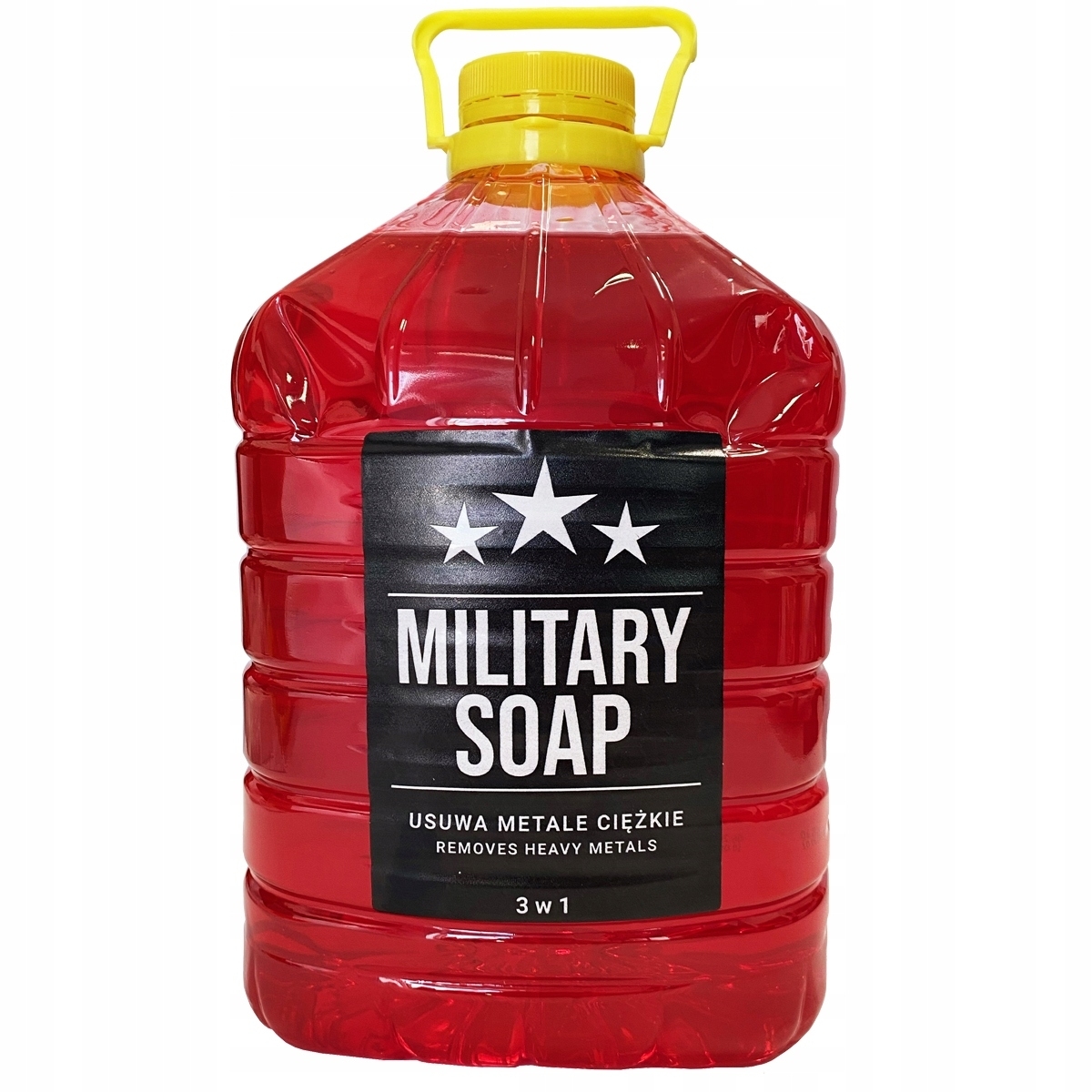 Mydło Military soap - to specjalistyczne, militarne mydło w płynie do rąk, ciała i włosów, które skutecznie oczyszcza z metali ciężkich. Zostało wzbogacone o substancje nawilżające, które zapewniają skórze właściwą ochronę, nie wysuszając jej oraz nadając gładkość. Mydło jest szczególnie przeznaczone dla strzelców (ołowica) oraz wszystkich osób pracujących w otoczeniu metali ciężkich takich jak: ołów, rtęć, kadm, chrom, nikiel, miedź i cynk. Metale ciężkie nawet w niewielkich stężeniach są bardzo niebezpieczne, uszkadzają wątrobę, nerki, układ nerwowy oraz sercowo-naczyniowy. Produkt przebadany dermatologicznie.
