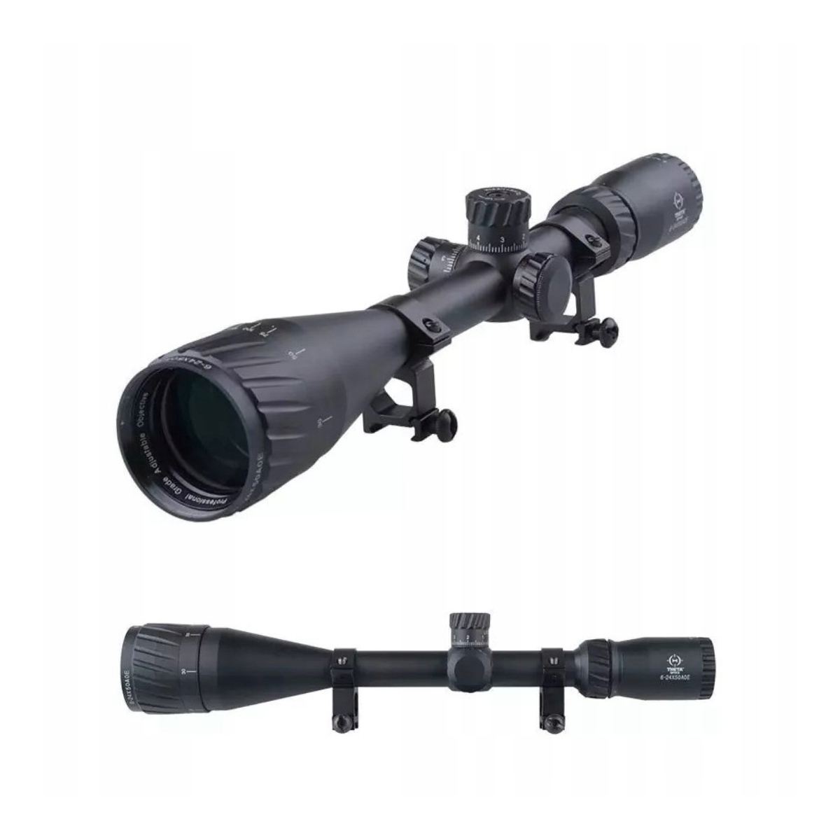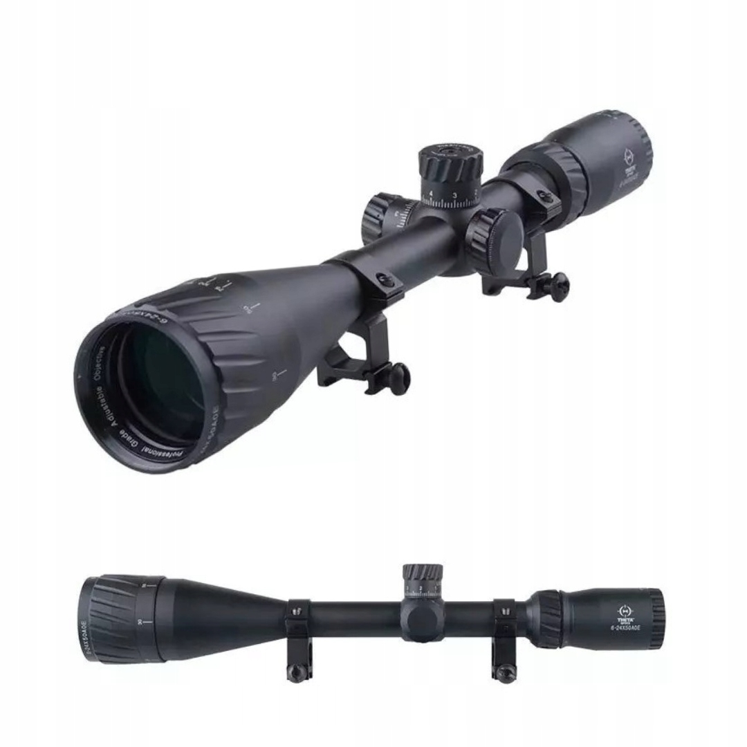 Luneta celownicza Theta Optics 6-24x50 AOE THO-10-018312-00 - model ze zmiennym powiększeniem 6-24 x i dużym obiektywem o średnicy 50 mm. Zamknięta w wytrzymałej, metalowej obudowie. W zestawie znajduje się montaż pozwalający zamontować lunetę na standardowej szynie RIS 22 mm. Zasilanie stanowi bateria CR2032.
