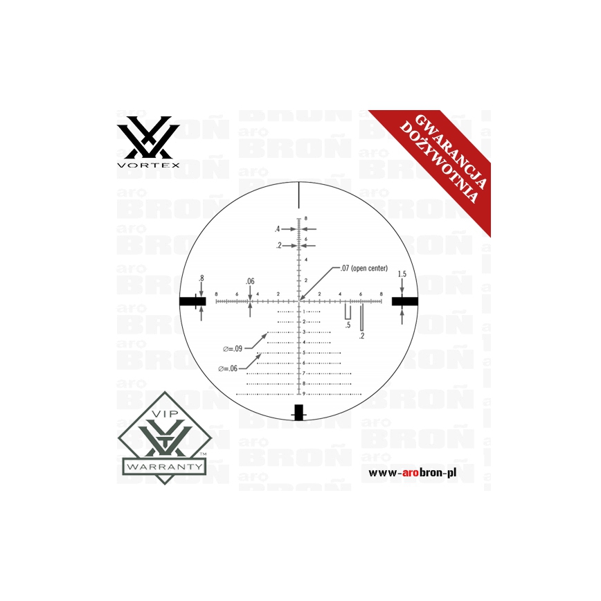 - Krzyż pozwala oszacować odległość od celu, opad pocisku na dowolnym powiększeniu i dokonać precyzyjnej korekty do wiatru.