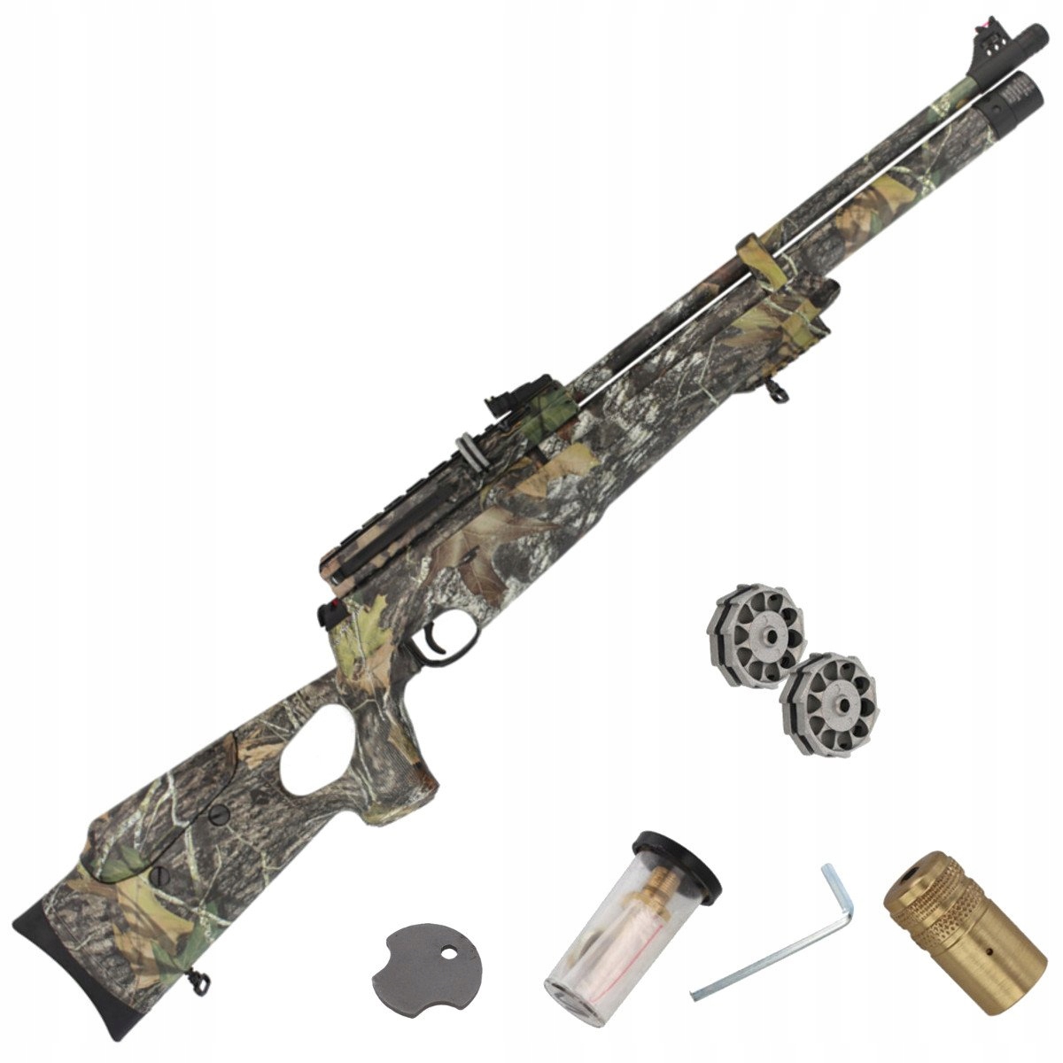 W zestawie: Wiatrówka Hatsan AT44-10 RG 5,5mm, 2 magazynki, szybkozłączka, komplet uszczelek, moduł do spuszczania powietrza.