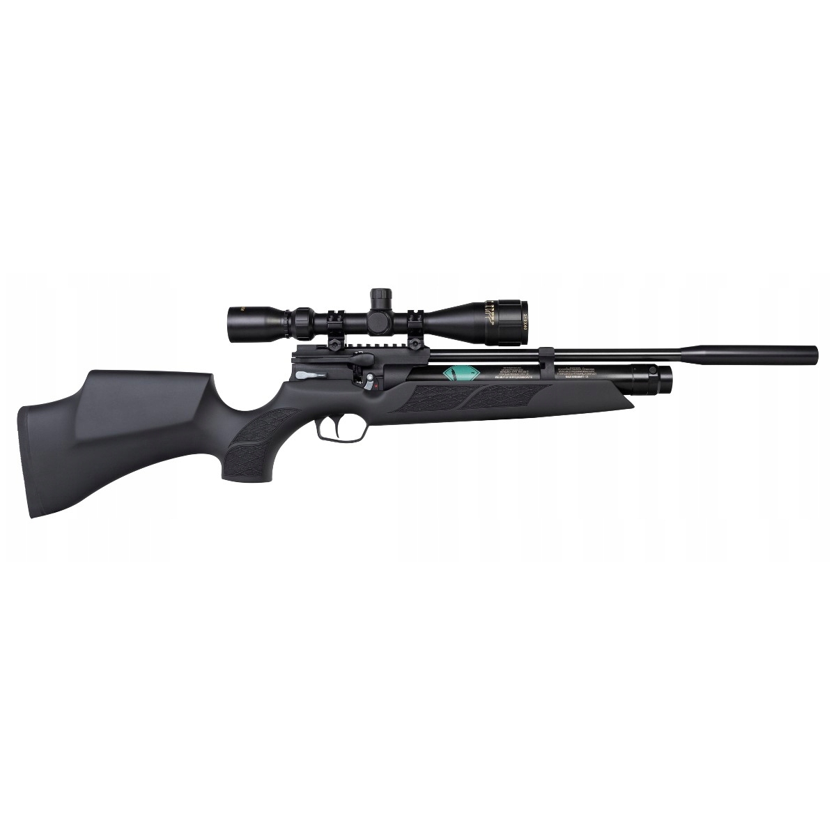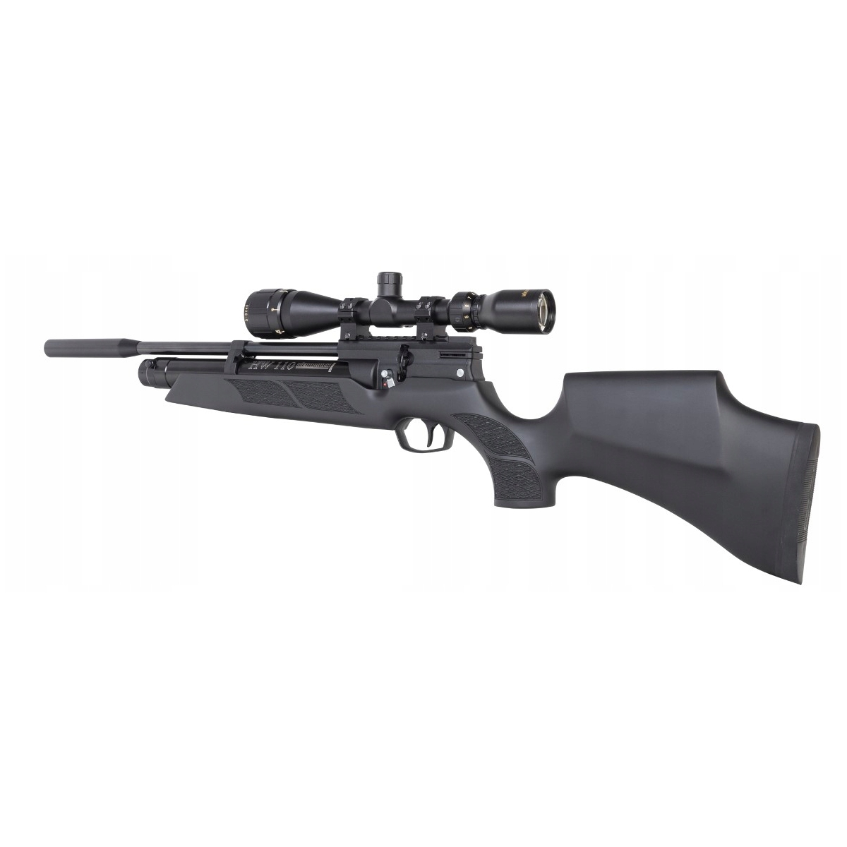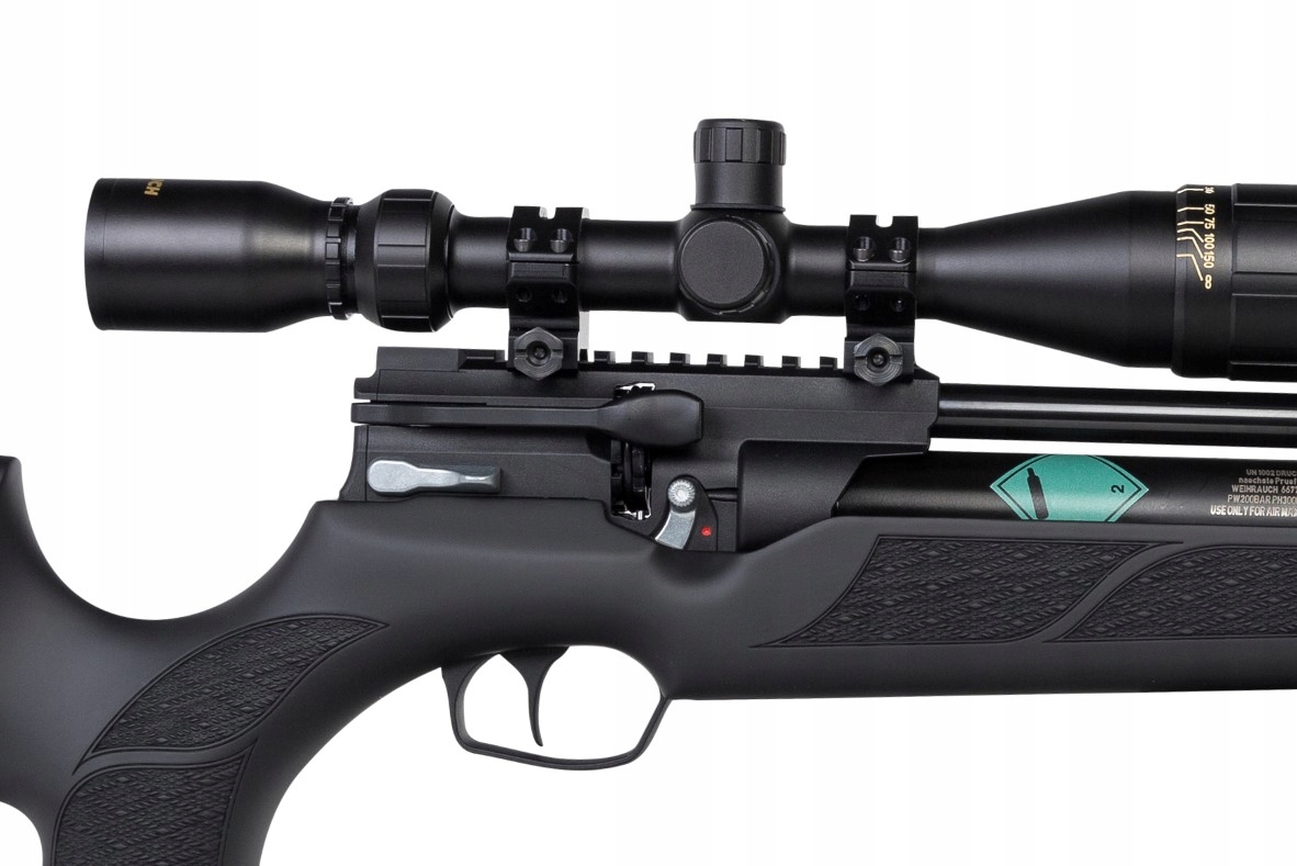Karabinek Weihrauch HW 110 ST- to najwyższej jakości i klasy wiatrówka PCP (na sprężone powietrze) niemieckiego producenta Weihrauch z kolbą wykonaną z polimeru w kolorze czarnym i odporna jest na uszkodzenia mechaniczne oraz zmienne warunki atmosferyczne. Duży komfort użytkowania zapewnia kolba zakończona gumową stopką i brak odrzutu podczas strzału. Na końcu bardzo dobrze wykonanej lufy znajduje się tłumik. Wiatrówka posiada regulowany dwustopniowy spust. Przed niekontrolowanym oddaniem strzału chroni bezpiecznik suwakowy umieszczona z boku. Magazynek posiada pojemność na 10 szt. śrutu diabolo. Kartusz wyposażony został manometr pozwalający w łatwy sposób kontrolować pozostałą ilość powietrza. Wiatrówka dzięki zastosowanemu regulatorowi ciśnienia charakteryzuje się dużą powtarzalnością.