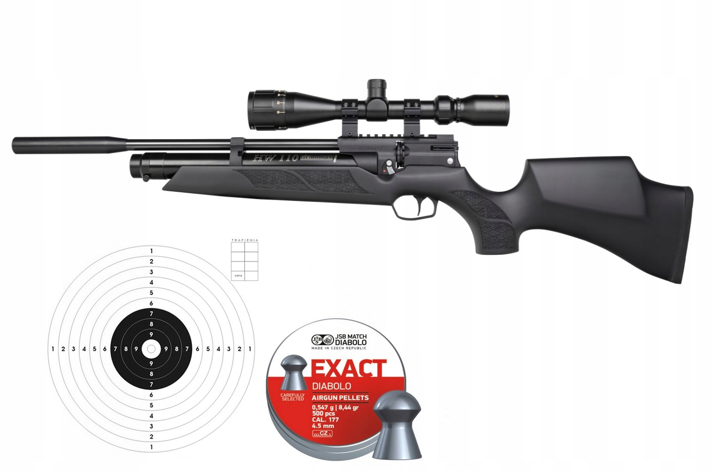 W zestawie: karabinek HW 110 4,5mm, 2 magazynki, Quickfill, opakowanie śrutu JSB Exact 4,50 mm, komplet tarcz 14x14cm.