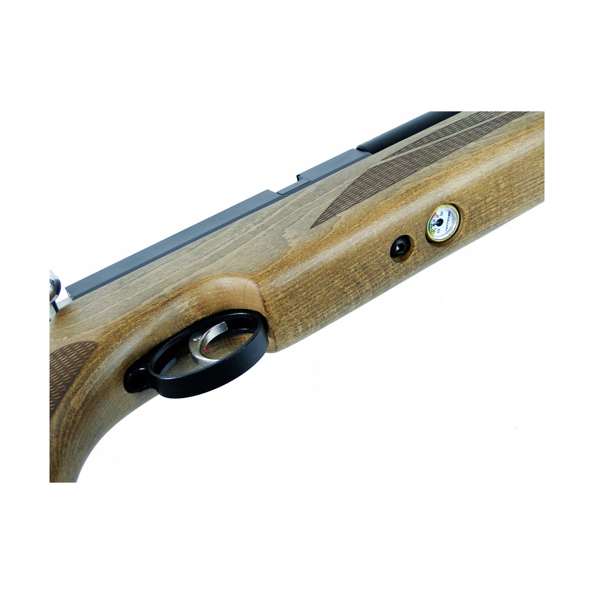 Karabinek wyposażony w przetykowy bezpiecznik który umieszczony jest w metalowym spuście, wiatrówka zaprojektowana do strzelania z lunety na standardową 11mm szynę montażową.