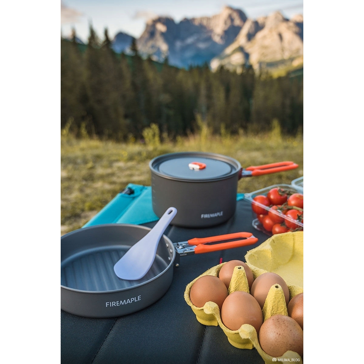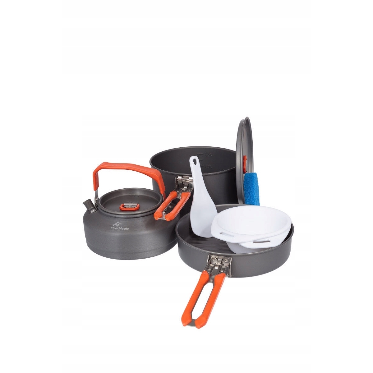 Naczynia Fire-Maple wykonane są z anodowanego i utwardzanego aluminium. Dzięki niemu są trwałe i łatwo utrzymuje się je w czystości. Każde z naczyń ma składaną rączkę. Garnek i patelnia posiadają rączki z automatyczną blokadą, która zapobiega samoczynnemu złożeniu się rączki. Wszystkie uchwyty – także uszka na pokrywkach – wykonane są przy użyciu tworzywa, które izoluje od gorącego metalu.