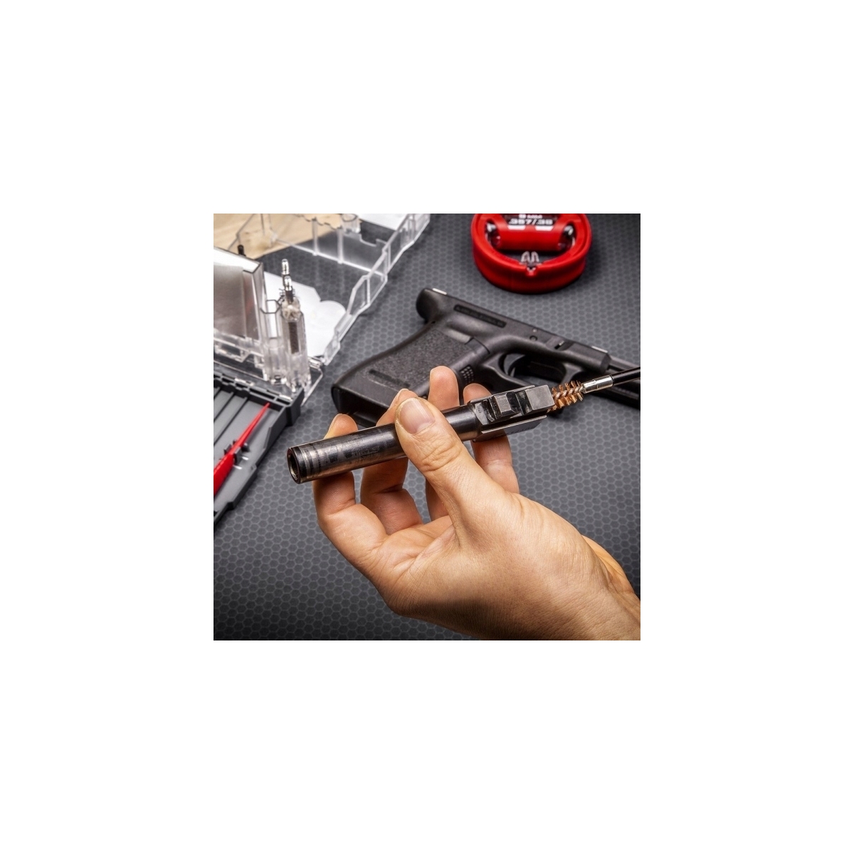 Specjalistyczny zestaw do czyszczenia pistoletów kalibru .357 cal / .38 cal / 9 mm. Zawiera wycior Bore Boss do szybkiego czyszczenia po każdym strzelaniu, oraz rozszerzony zestaw do czyszczenia broni, wyposażony we wszystkie narzędzia potrzebne do pełnego czyszczenia lufy, iglicy i komory.