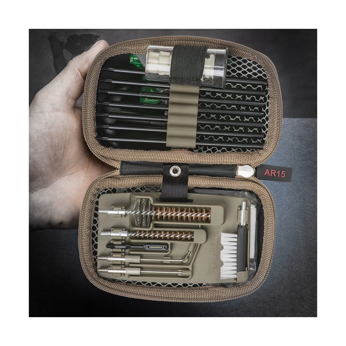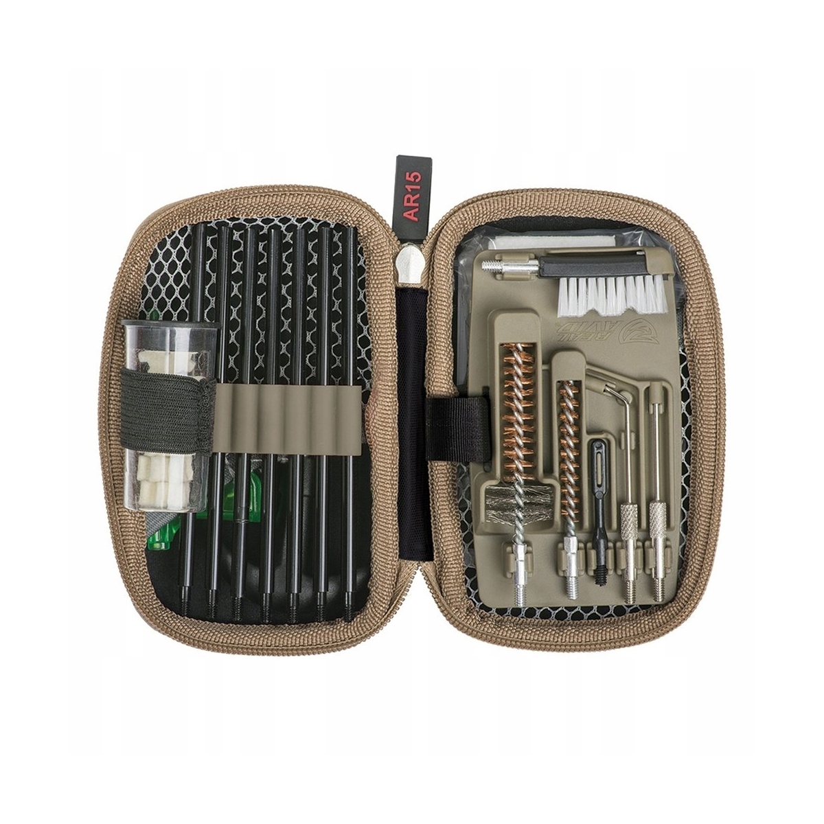Poręczny zestaw do czyszczenia broni systemu AR15, w kompaktowym futerale z nylonu. Zawiera wszystkie niezbędne narzędzia, aby przeprowadzić bieżącą konserwację i czyszczenie lufy oraz zamka - wycior, szczotkę, skrobaki, przecieraki z filcu i nie tylko.