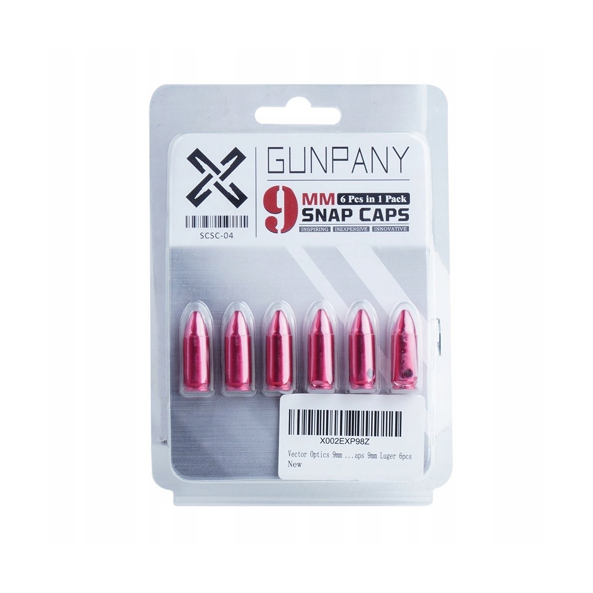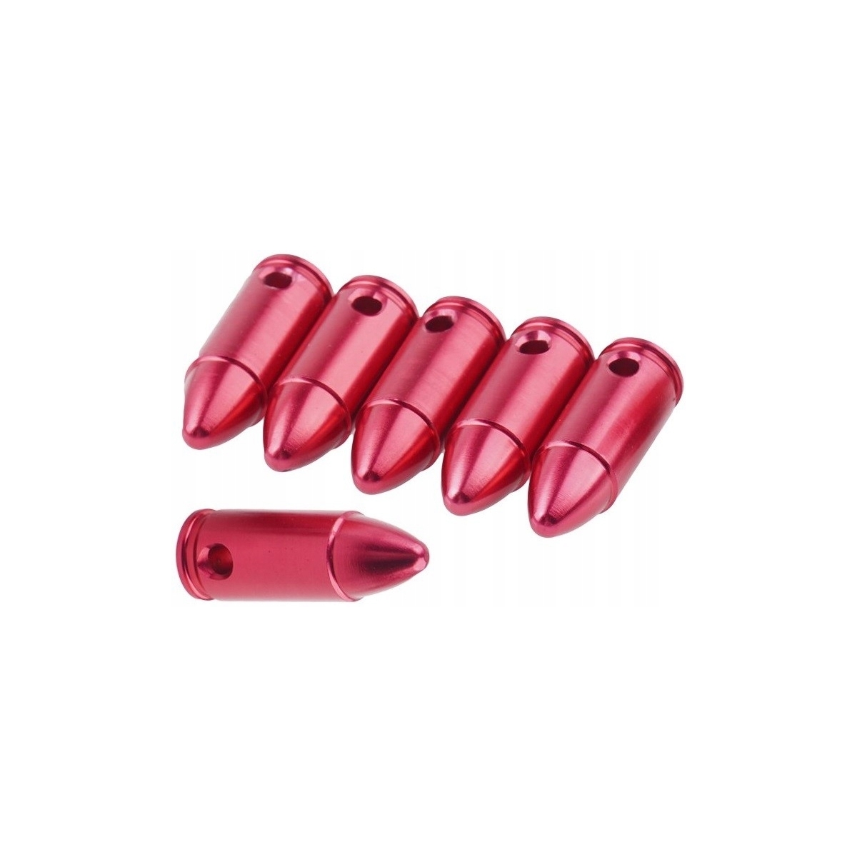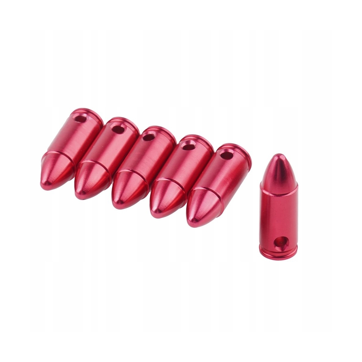 Zestaw sześciu zbijaków w kalibrze 9x19 mm wykonanych z wytrzymałego aluminium anodowanego na kolor czerwony. W miejscu spłonki wstawiono silikonowe wypełnienie chroniące iglicę podczas testowania.