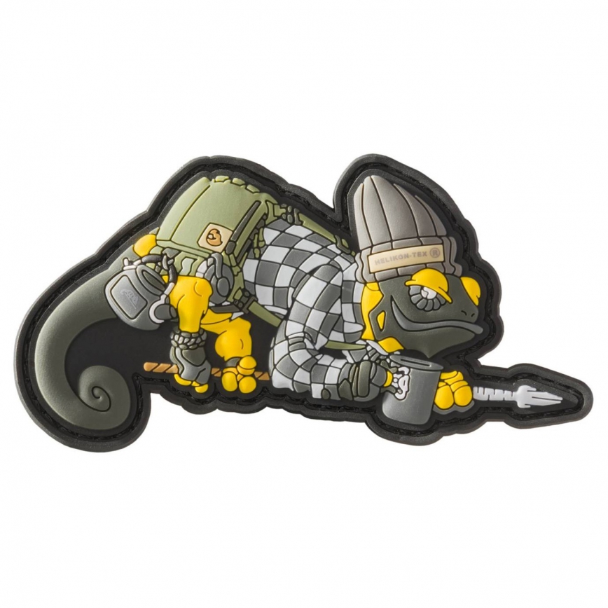 Wykonany z PVC emblemat, tzw. Morale Patch. Specjalna wersja emblematu z kameleonem, bazująca na logo Helikon-Tex®, nawiązująca jednocześnie do linii BUSHCRAFT. Kameleon na emblemacie ubrany jest w kraciastą koszulę oraz czapkę WANDERER. Dodatkowo ma przy sobie liczne akcesoria bushcraftowe, w tym BUSHCRAFT Satchel, kubek oraz czajnik obozowy. W łapach trzyma typową dla Helikon-Tex® włócznię.. Umieszczony od spodu rzep ostry umożliwia przyczepienie do odzieży, plecaków, toreb itd., dzięki czemu można je w łatwy sposób spersonalizować.