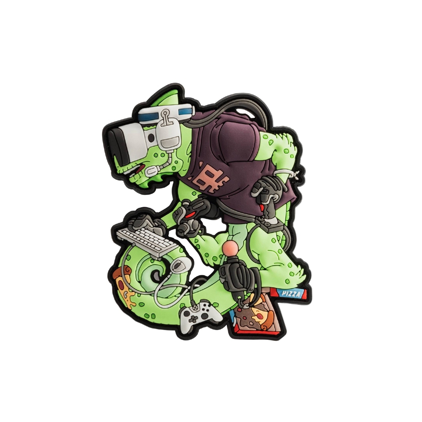 Wykonany z PVC emblemat, tzw. Morale Patch. Specjalna wersja emblematu z kameleonem, zaprojektowana z myślą o graczach. Kameleon nie tylko trzyma różne pady, joy sticki oraz klawiaturę, ale także wyposażony jest w zestaw słuchawkowy oraz gogle VR. Kolejnymi zabawnymi akcentami są koszulka z charakterystycznym, gamingowym motywem oraz pudełko pizzy w dolnej części emblematu.Umieszczony od spodu rzep ostry umożliwia przyczepienie do odzieży, plecaków, toreb itd., dzięki czemu można je w łatwy sposób spersonalizować.