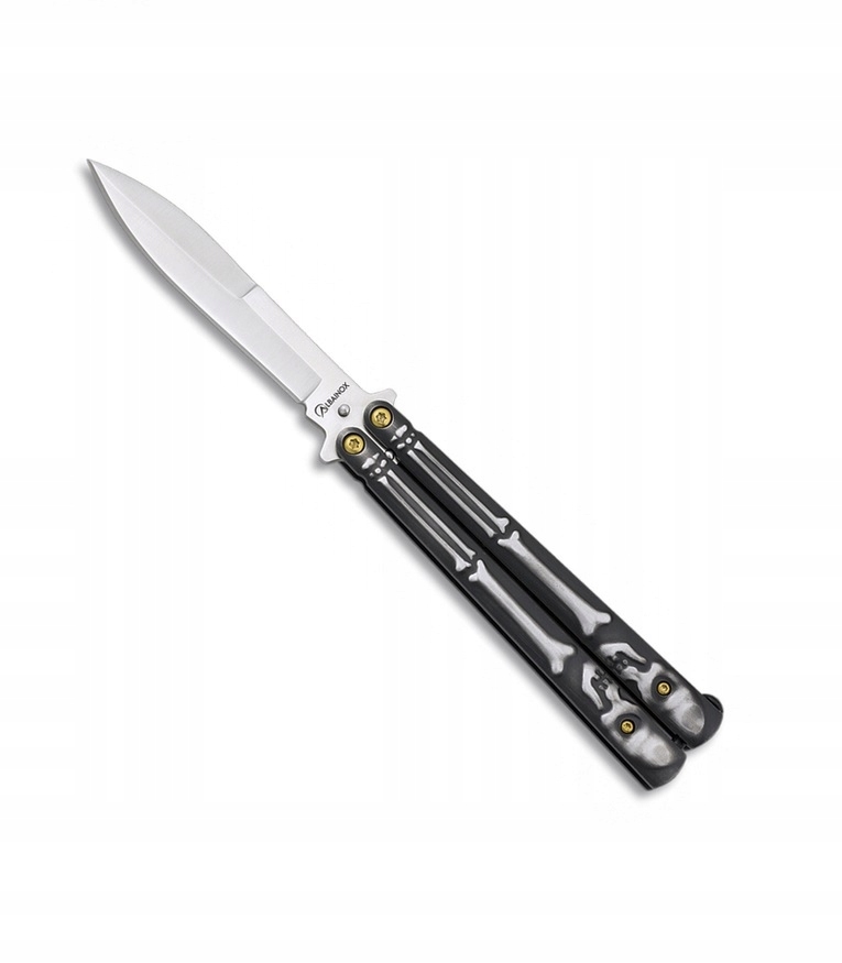 Nóż motylkowy Balisong Albainox SKELETON 36256 - rękojeść z niekonwencjonalną dekoracją wykonano w całości z aluminium. W pozycji zamkniętej i otwartej motylek blokowany jest solidnym trzpieniem - blokadą typu notch.