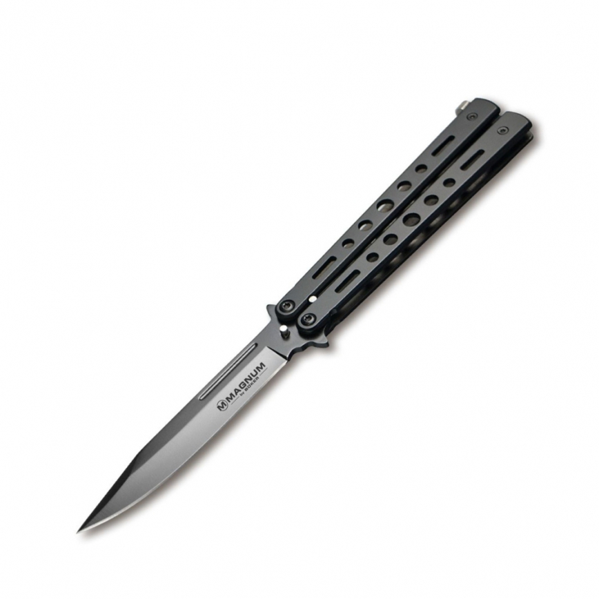 Nóż motylkowy Boker Magnum ALL BLACK to nóż służący do wykonywania trików. Ostrze wykonane zostało ze stali nierdzewnej 440A. Waga motylka wynosi 129g.