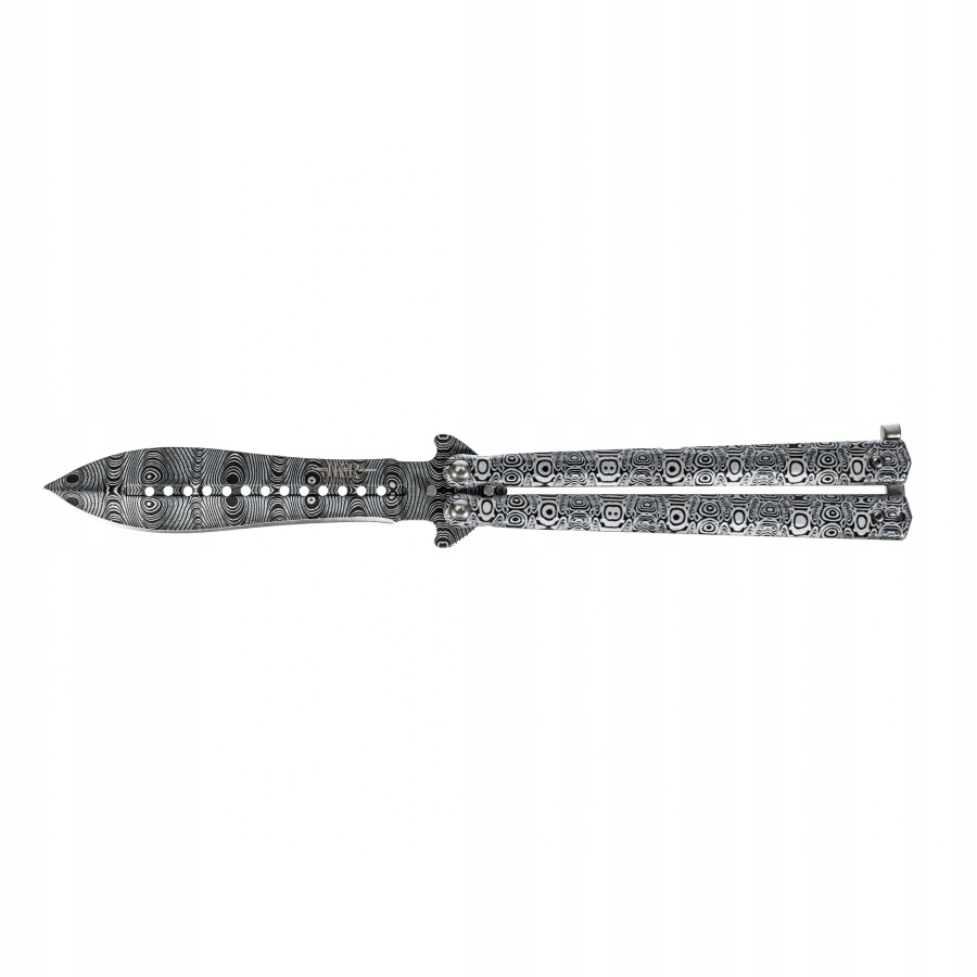 Nóż Joker JKR64 to nóż motylkowy o solidnej metalowej konstrukcji oraz efektownym czarno-szarym wykończeniu typu damast. Podany modej wyposażony jest w łożyska ślizgowe, które pomagają w wykonywaniu efektownych trików, a jego rękojeść została wykonana z aluminium.