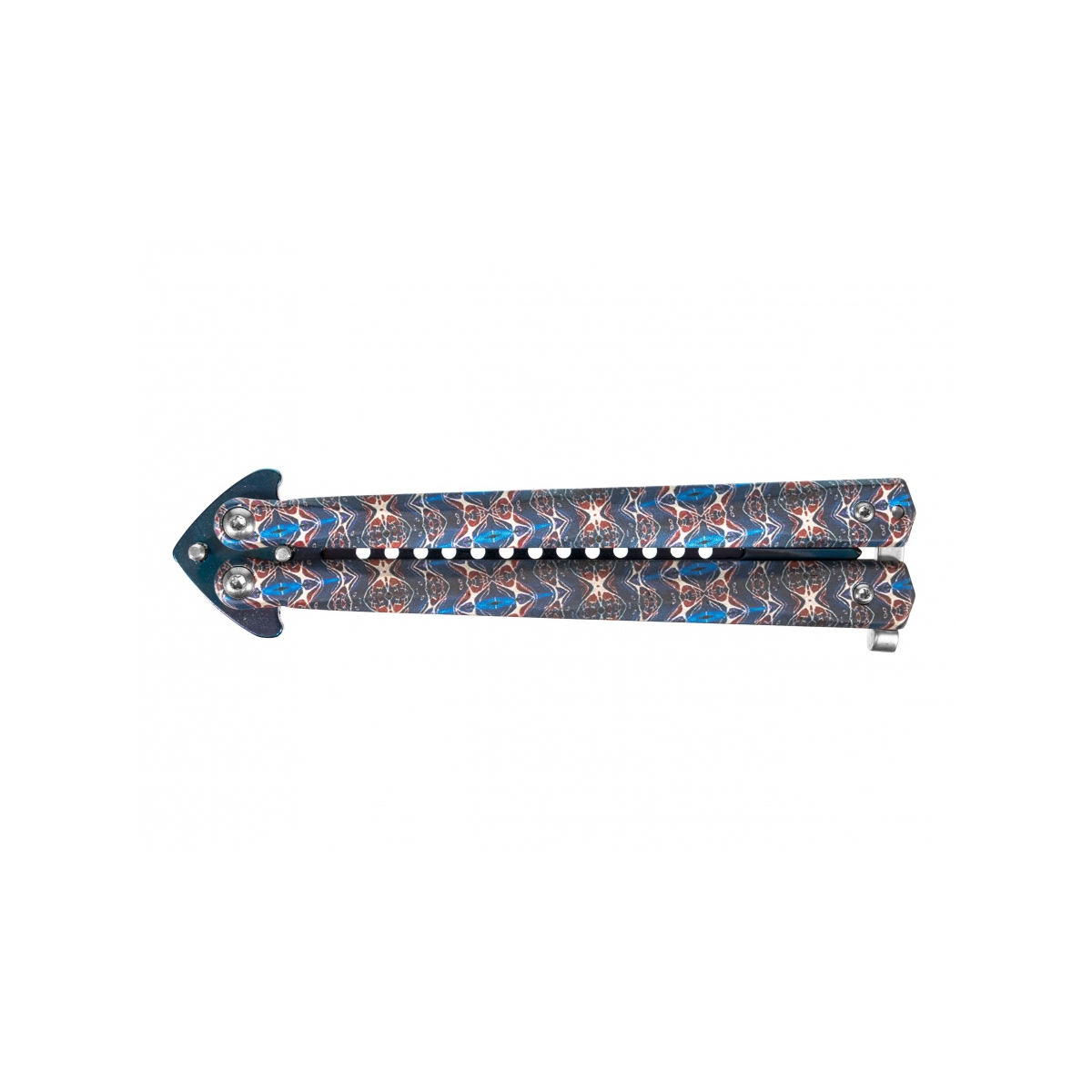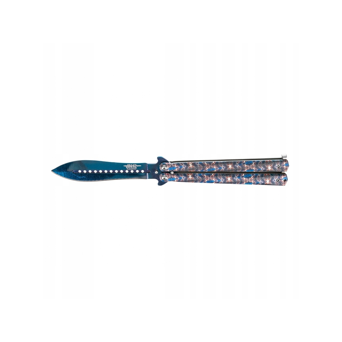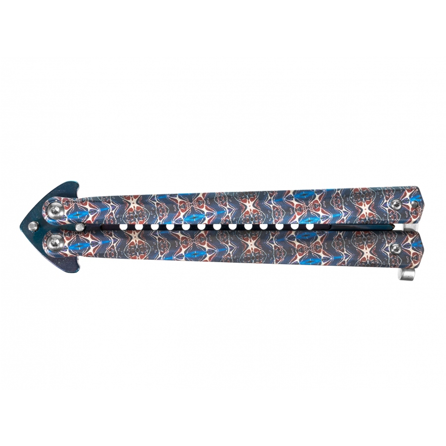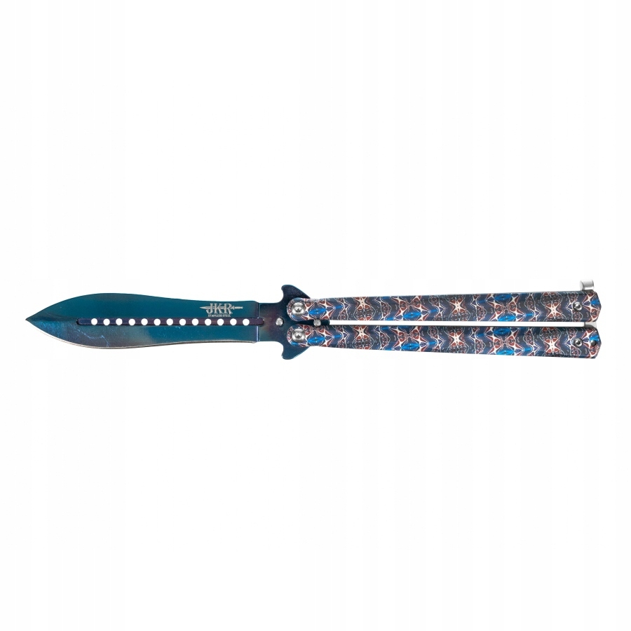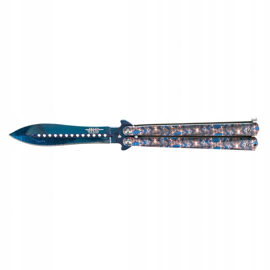 Joker JKR643 to nóż motylkowy o solidnej metalowej konstrukcji oraz efektownym niebieskim wykończeniu typu damast.