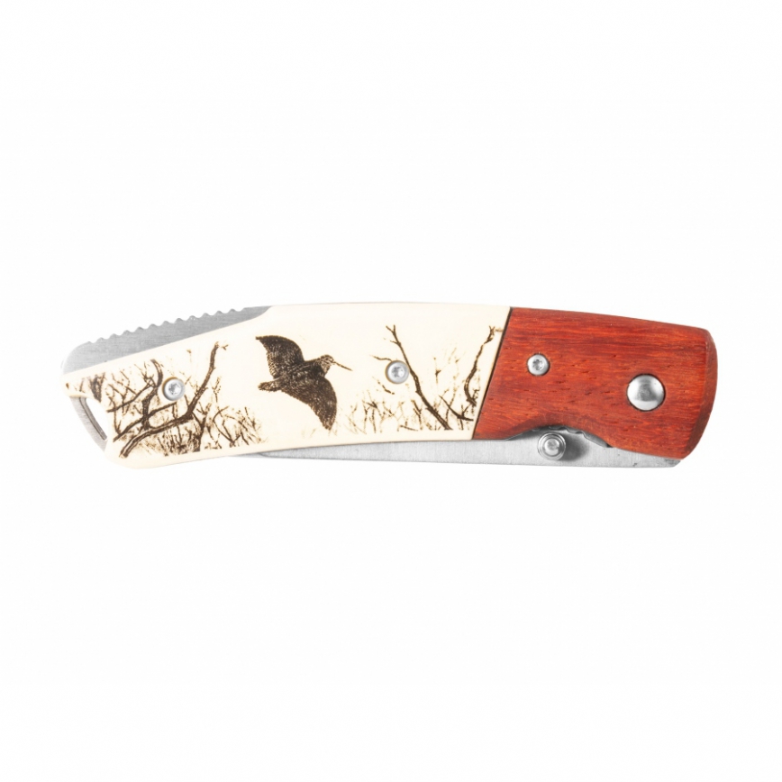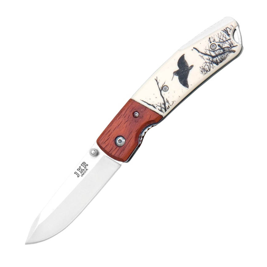 Nóż składany JOKER JKR367 wykonany został ze stali nierdzewnej. Rękojeść posiada okładziny po części z drewna i z wytrzymałego tworzywa sztucznego imitującego kość słoniową zdobionego motywem myśliwskim. Ostrze otwiera się za pomocą kołka. Bezpieczeństwo użytkowania zapewnia blokada liner lock. Nóż świetnie sprawdzi się na wyprawach, wędkarstwie i myślistwie.